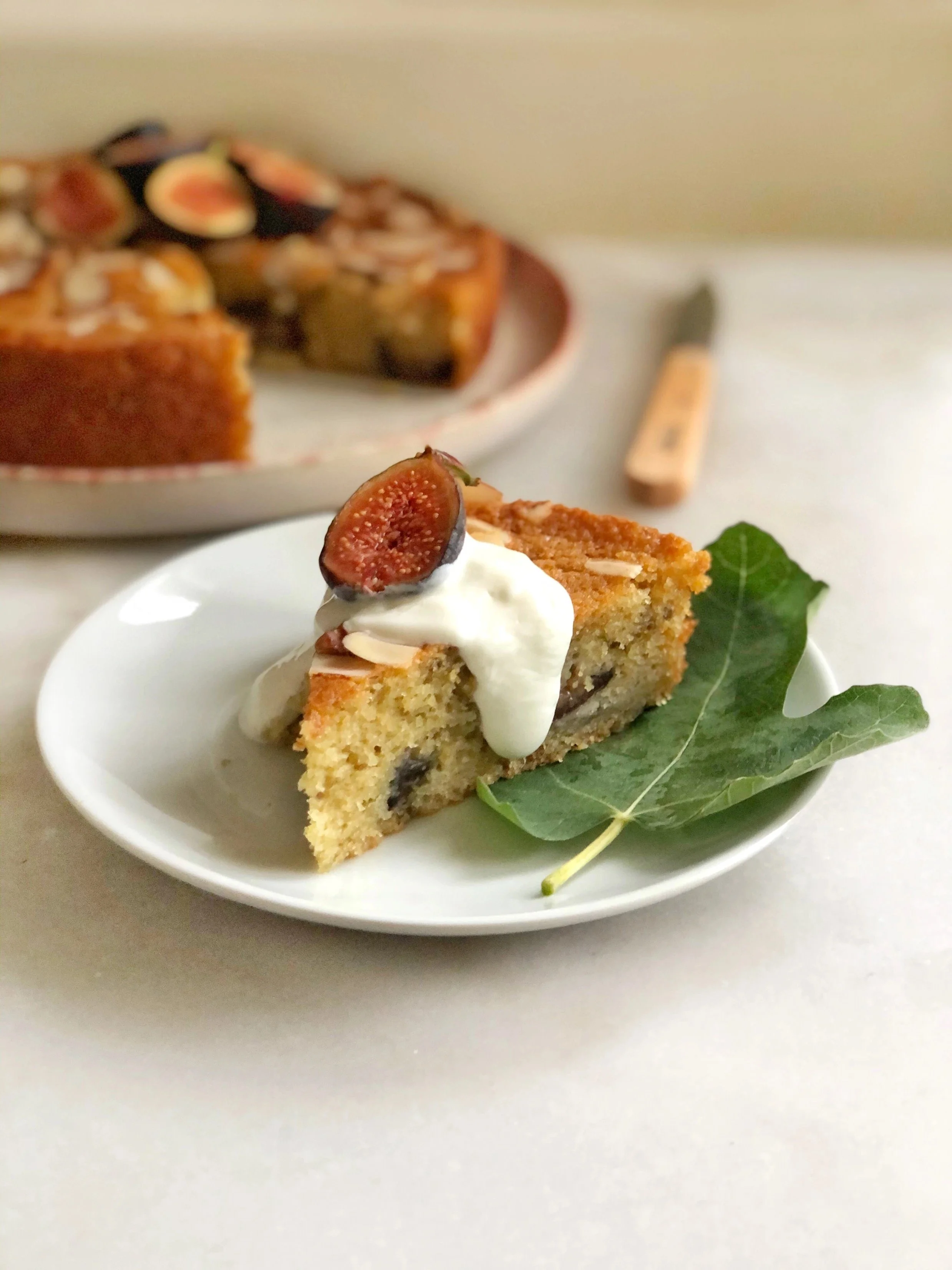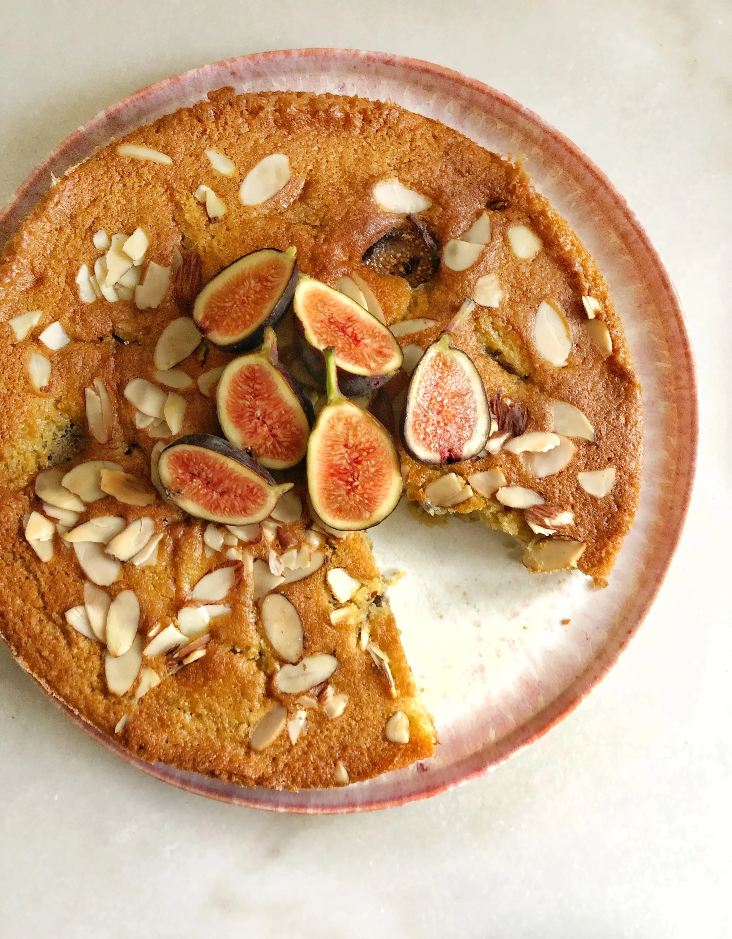 Pour the batter into the prepared cake pan. Top the cake with the sliced figs until you cover the top. Add the sliced almonds. The fruits will sink ever so slightly creating delicious dimples of fruit into the cake once cooked.