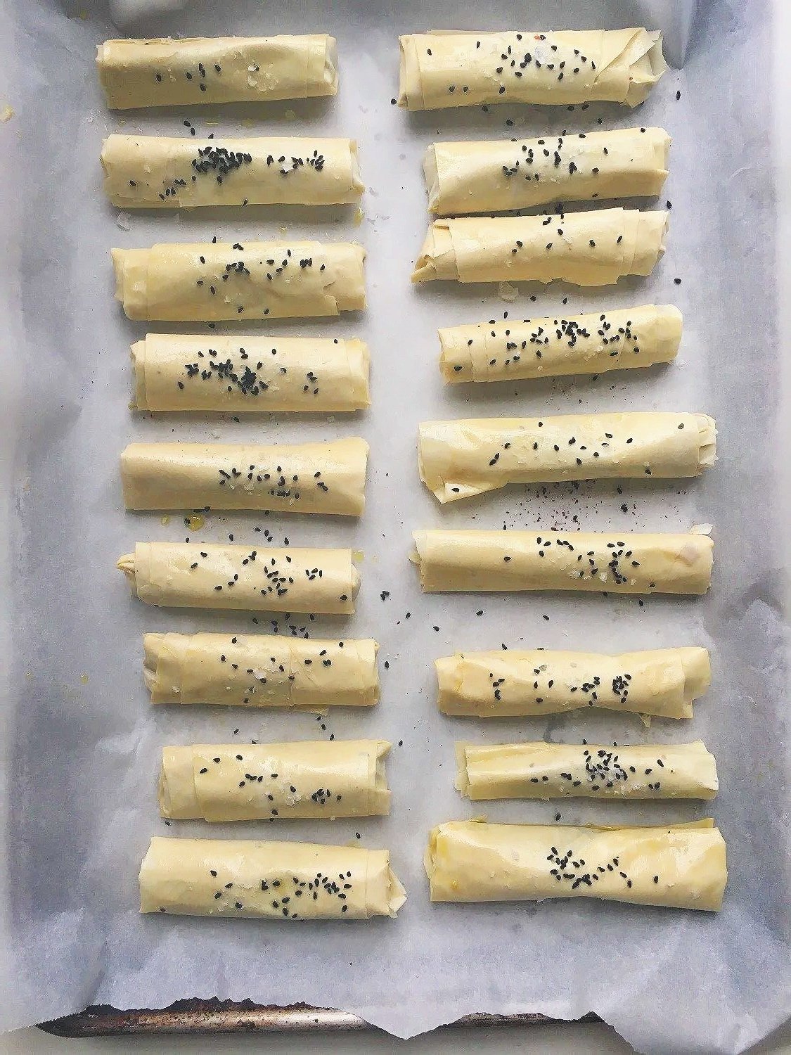 Line the cigars in a parchment lined baking sheet and bake in a 350 oven for about 20 min until golden and crisp.