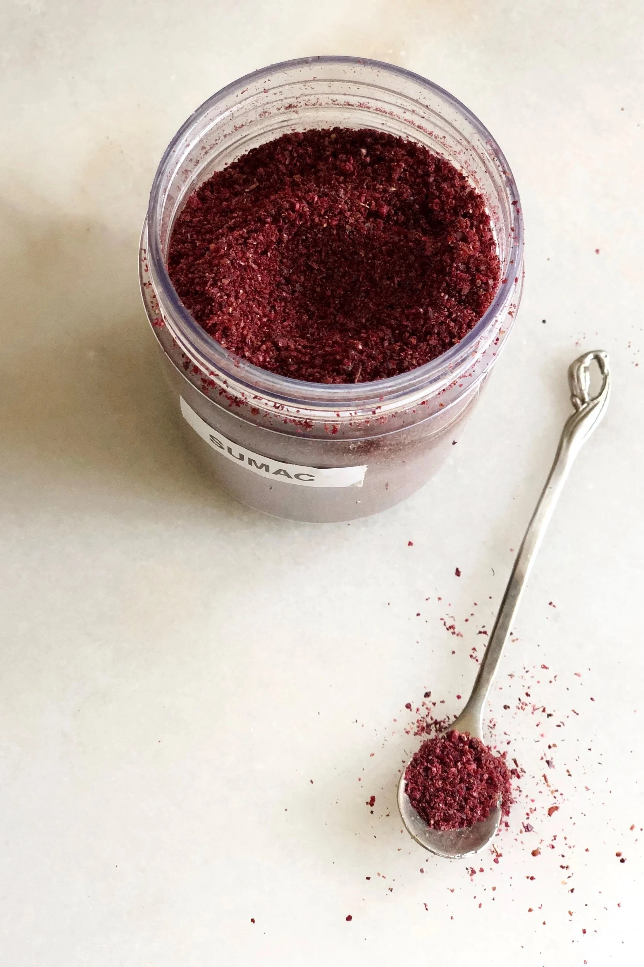 The sumac bush, native to the Middle East, produces deep ruby red berries. My father in law has his own bushes in Jordan and once they harvest the berries and dry them, he would then send them to the local mill where they grind them into coarse powder. Ground sumac is a versatile spice with a tangy lemony flavor. Its more balanced and less tart than lemons.