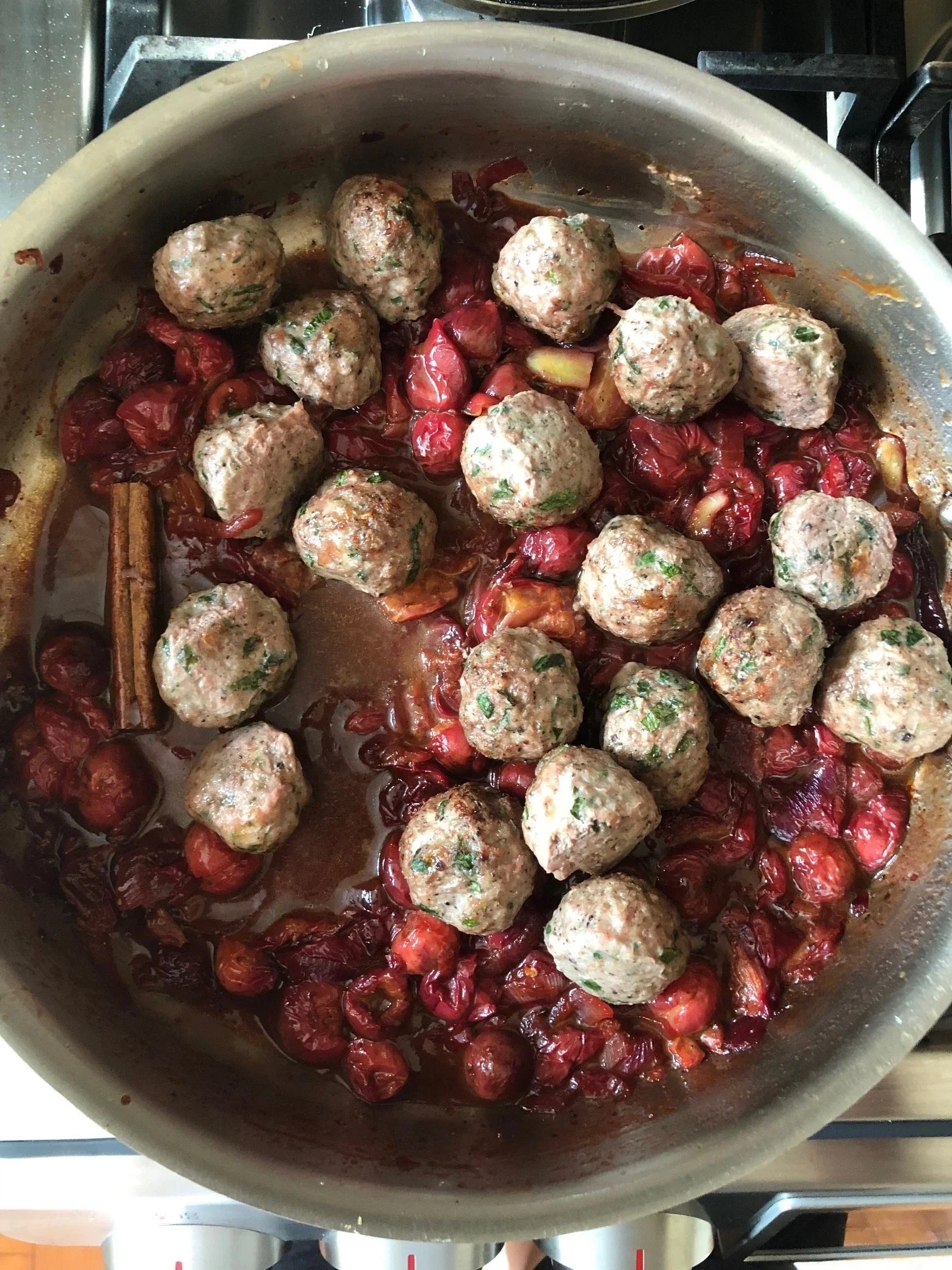 Add the meatballs and their juices to the cherry sauce and simmer for another 15 minutes, until tender and cooked through.