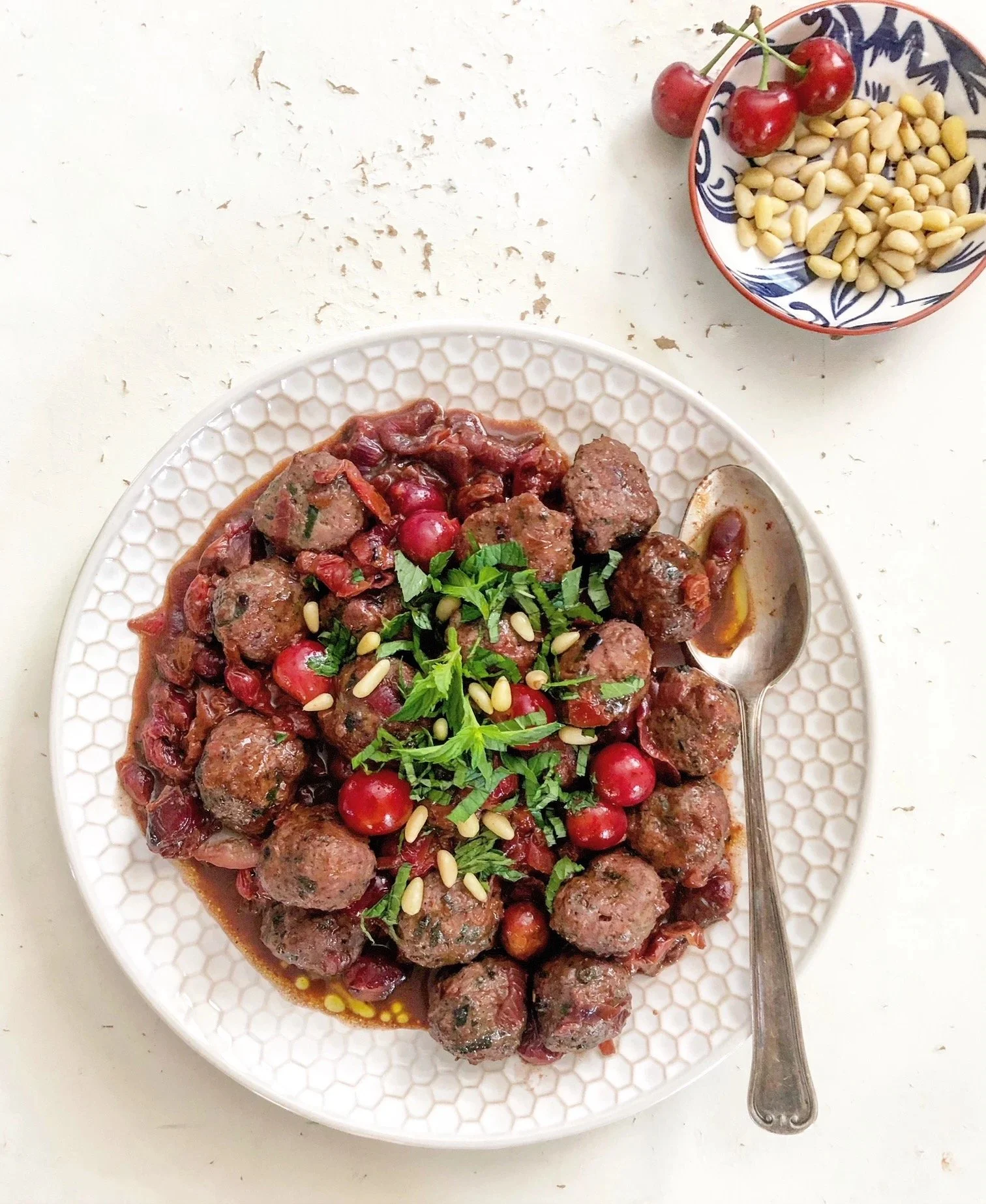 In honor of my grandmother, my Armenian great grandparents, and our visit to the Armenian quarter in Jerusalem (story saved under highlights on IG), I wanted to make this dish called Fishnah Kebab (cherry kebab). This is a classic Armenian and Syrian meatball dish, native to the city of Aleppo. It is served with a sauce of wild sour cherries, which is a variety grown in specific regions of Armenia. I made this with local sour cherries that I found here from Michigan, but you can also make it with frozen or canned unsweetened cherries as well (more about that in the recipe below). I dedicate this dish to my amazing grandmother and her life story that's nothing but sweet and sour. Her story has taught me so much about life. She was born to Armenian parents and married my Palestinian grandfather who I have never met and who my mother vaguely remembers. My tita lost her husband due to a truck crash in the Jordanian mountains just a few years after their marriage and right after my mom was born. My Tita was left to care for her 3 children alone. She lived in a small house that my grandfather bought before he died in a town called Beit Safafa, a new neighborhood that barely had any neighbors or living souls at the time. Her neighborhood turned into a ghost town during the 1967 war. Fearing for her life and the life of her children, she left her home to go to Jerusalem. After the war was over, she insisted on going home, which really was the only remembrance of her husband.