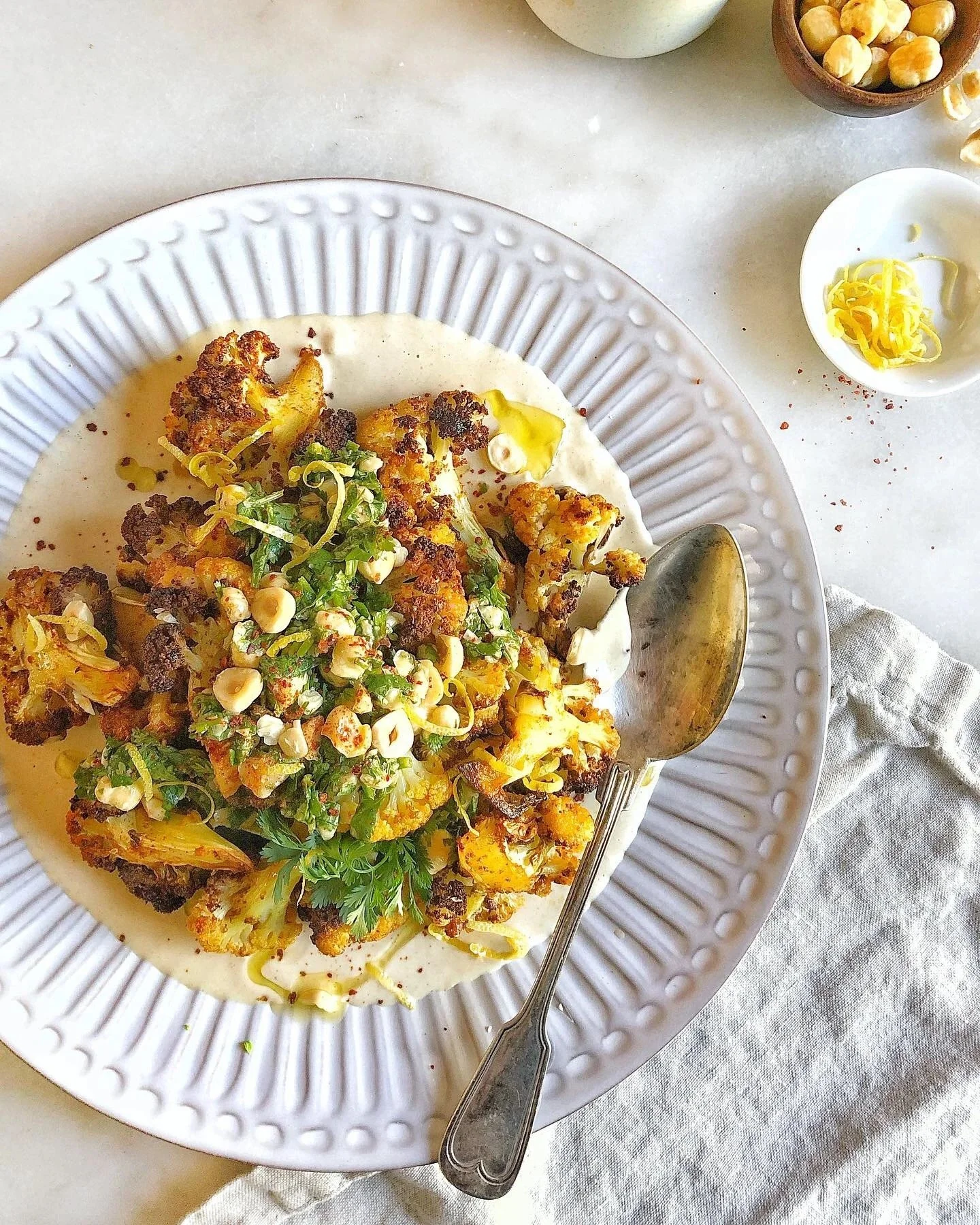 Crispy cauliflower salad with a Tahini lemon sauce and topped with a fresh cilantro and toasted hazelnuts Gremolata.