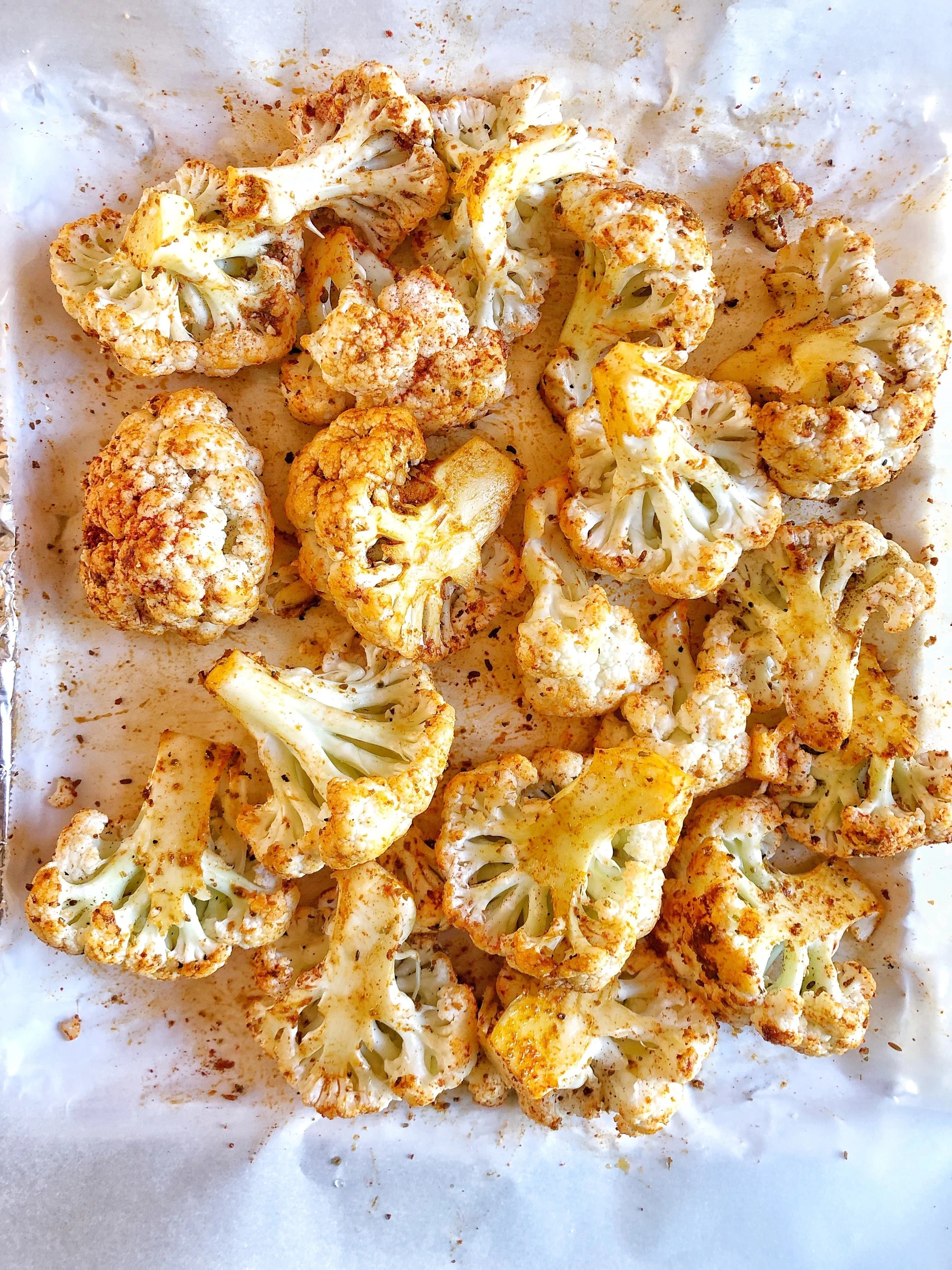 Cut the cauliflower into bite size florets, toss with the spices and oil to combine.