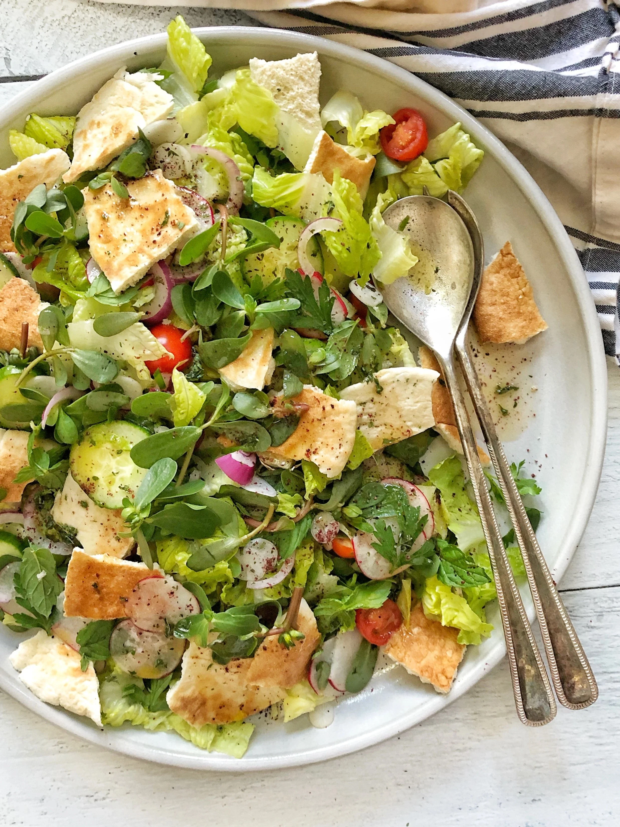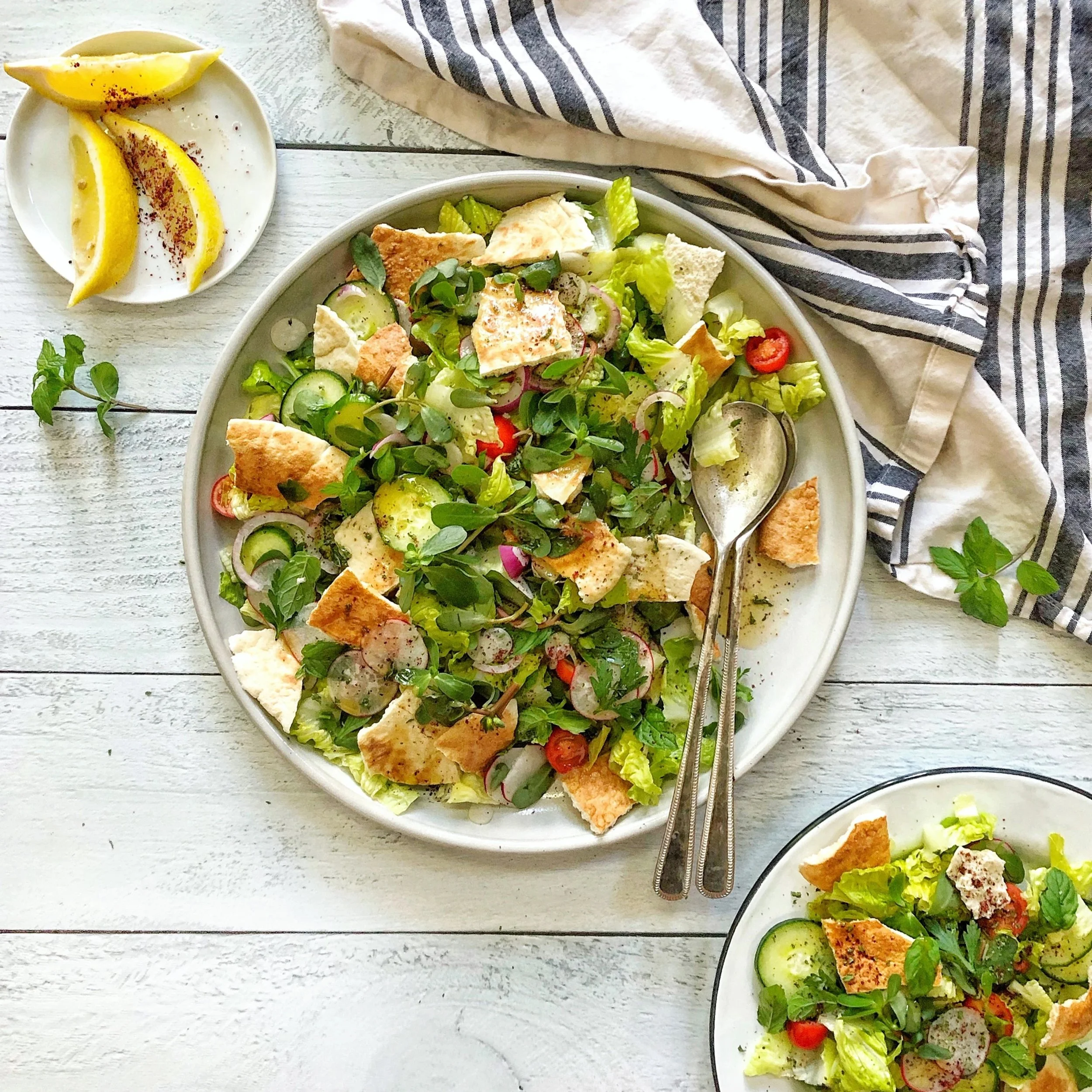 Fattoush salad is consumed all over the Middle East. The salad was built on the idea that farmers would use leftover stale bread and soak it with seasonal vegetables and herbs to create a more hearty fulfilling & rather an inexpensive meal. Bread plays an important part of meals in the Middle East. Its absolutely delicious warm to dip in a plate of creamy hummus, to make a falafel sandwich or to mop the bottom of the stew pot. But because much of the bread that is consumed is a flatbread “khubez, and the most known one is a pita bread, it dries out and becomes stale pretty quickly.
