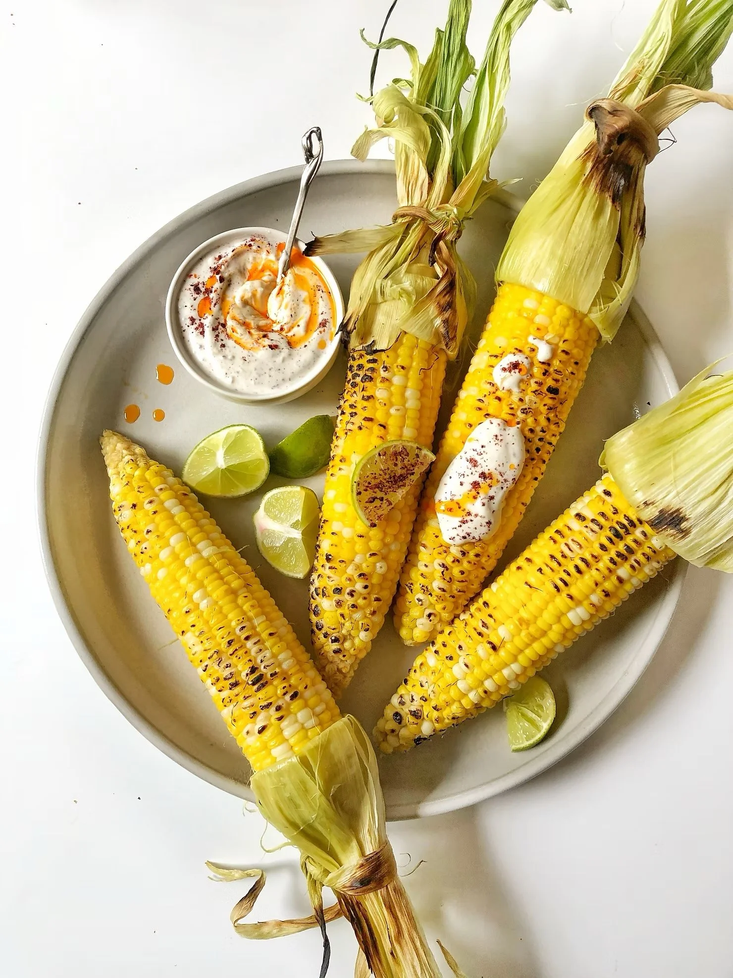 Corn is sweet, crunchy and comes already in a perfect package (husks) to throw on the grill. This simple recipe of fire roasted corn, slathered with a sumac lemon aioli is just a perfect bite for a summer dinner outside on the patio.