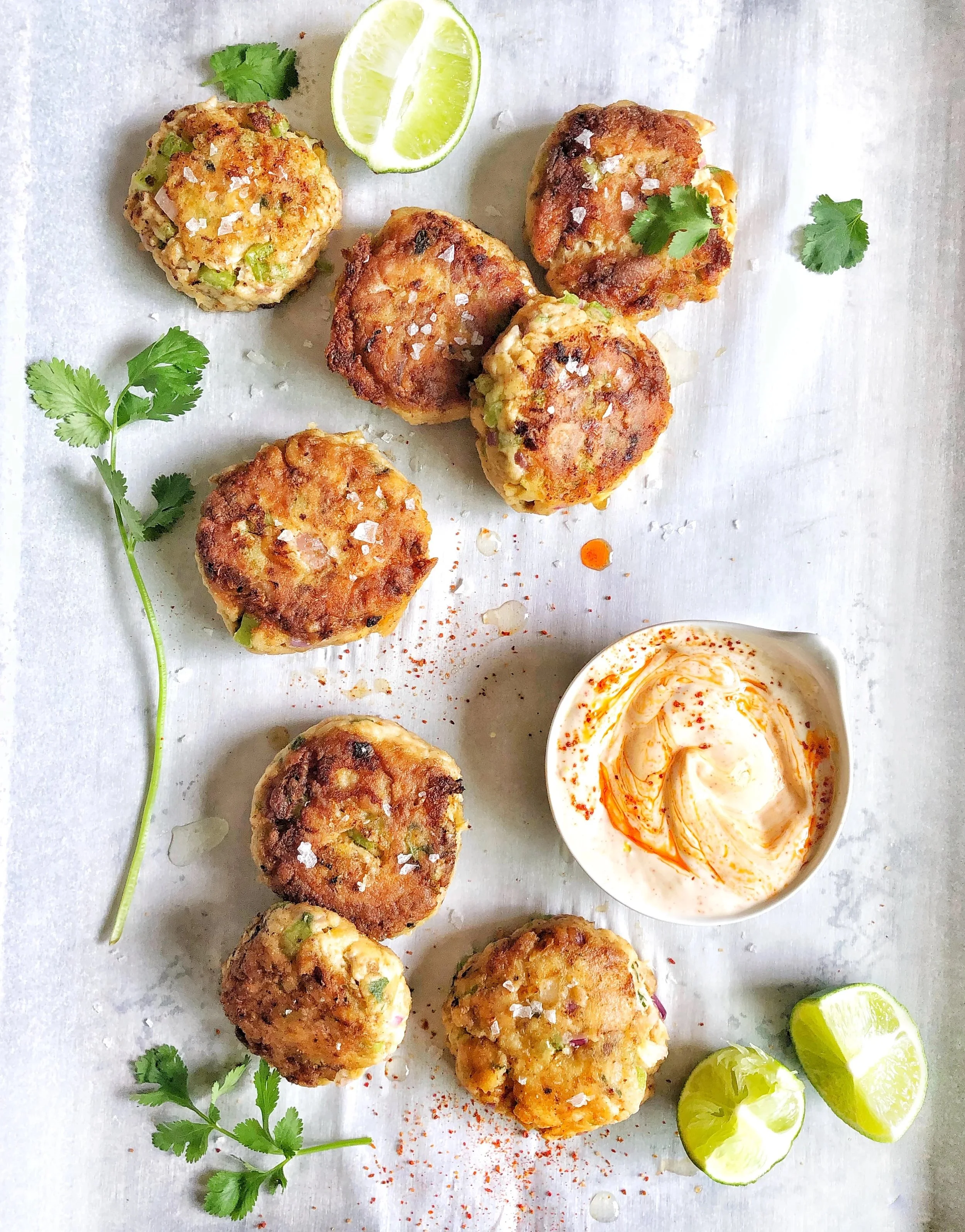 Heat remaining 3 tablespoons of olive oil in a large saute pan over medium heat. Cook patties for 3-4 minutes on each side or until warmed through and develop a nice crust (remember your fish is already cooked).