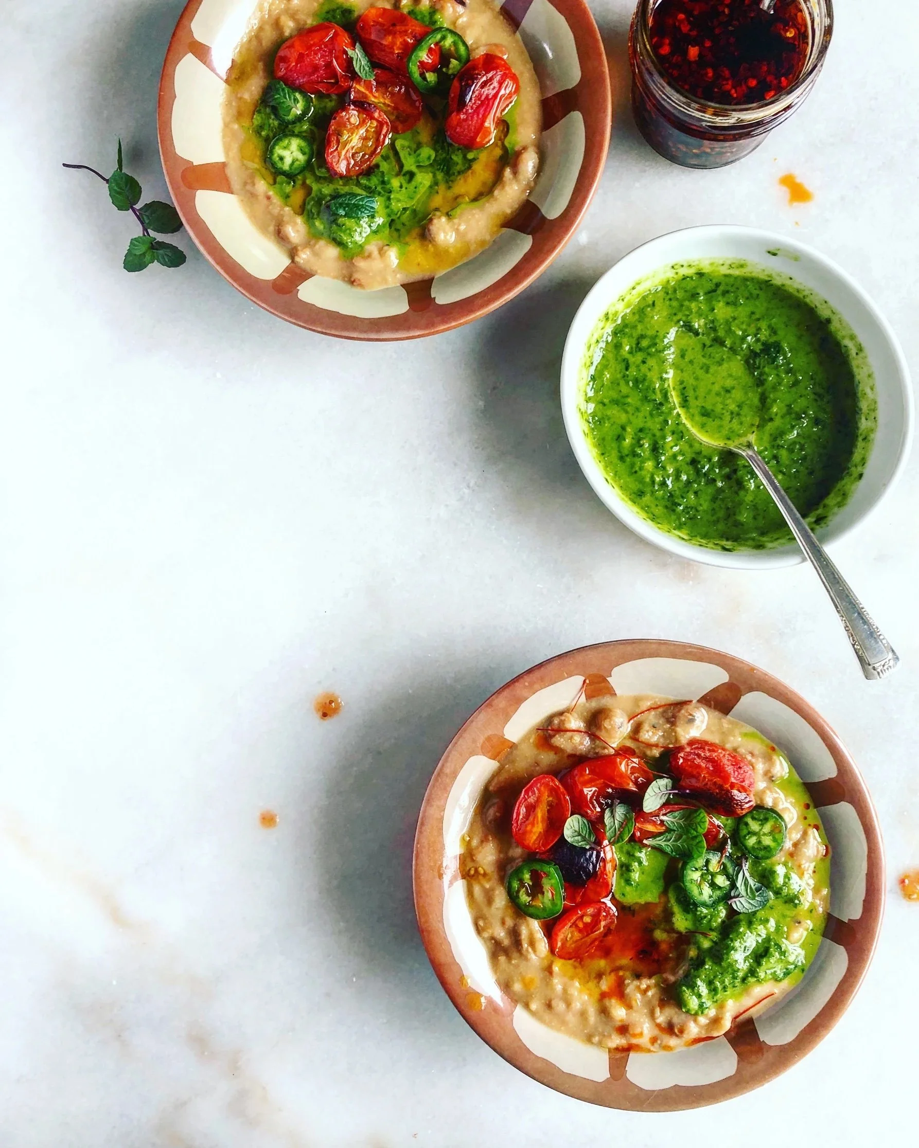 Foul Mudammas is often served at breakfast but not any breakfast. Growing up it was a dish reserved for weekend brunch with the whole family. Arab weekend breakfasts are often elaborate, and a time to mingle around the table for hours. The whole family will feast and nibble on all sorts of little dishes that are scattered all over a long table. Many of the dishes come from the pantry. Like olives, pickles, zaatar, jams and halaweh (halvah). And at least one egg dish is served. Boiled eggs, fried eggs in olive oil, eggs and potatoes or herbs etc. Many fresh cut veggies like crisp cucumbers, radishes and tomatoes and herbs are served next side to bowls of hummus and foul. The foul and hummus were hardly ever made on weekends, they were often bought from your favorite local joint. My mom would send my brothers to get them from the neighborhood tiny stall that served endless bowls of the most delicious creamy foul and hummus and on the way back my brothers would pick warm pitas or Jerusalem kaek from the local bakery fresh enough for this feast. The foul was often cooked in big brass urns, or clay pots and cooked slow for hours making this an anticipated weekend brunch dish. When you buy foul its often accompanied by a green sauce and shattah (chili paste). piping hot pots of mint tea accompany every breakfast table. Coffee is never served with food.