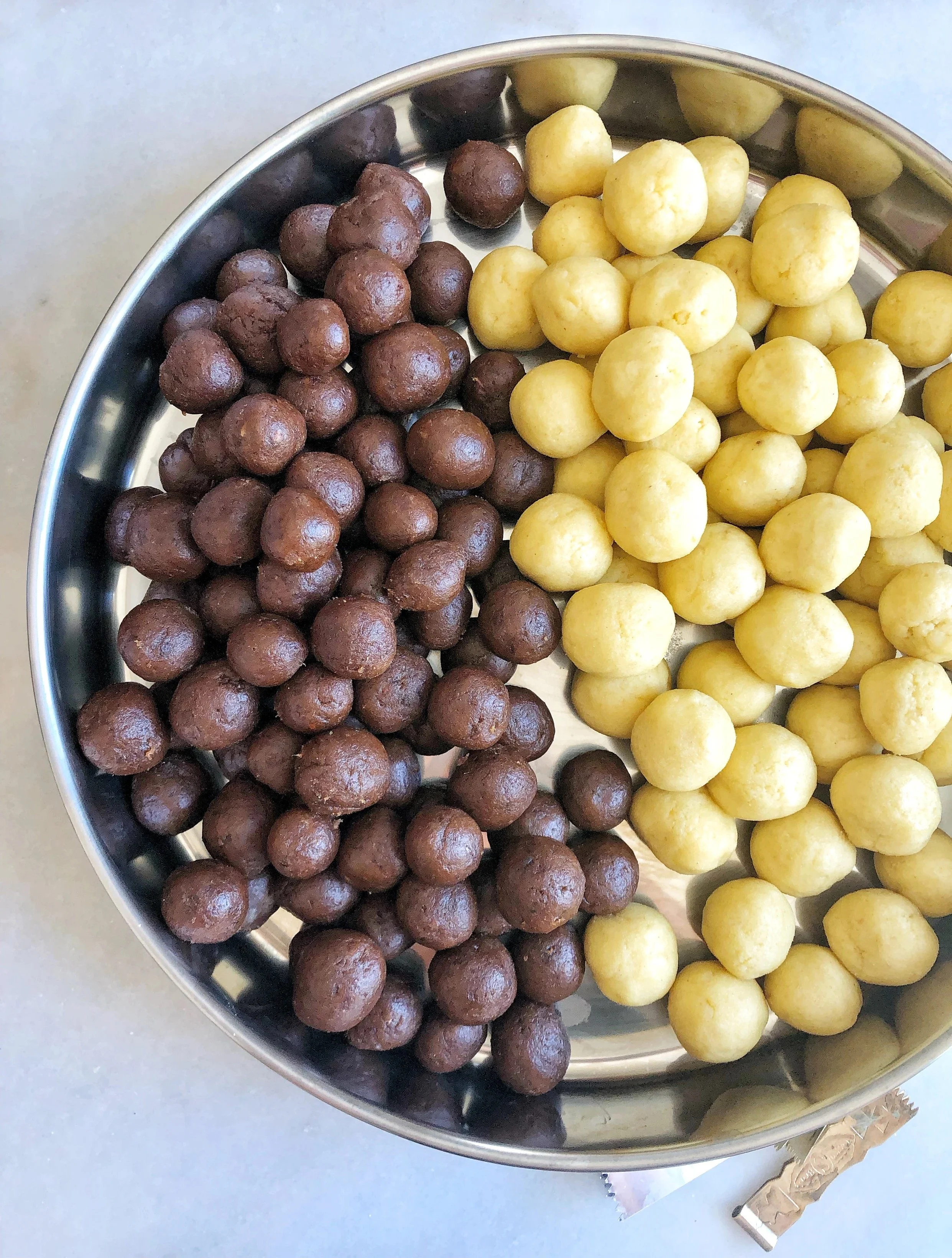Using a one tbls cookie scooper measure divide the dough into balls and set aside on a tray. Cover your dough with plastic wrap until ready to use so it doesn't dry out.