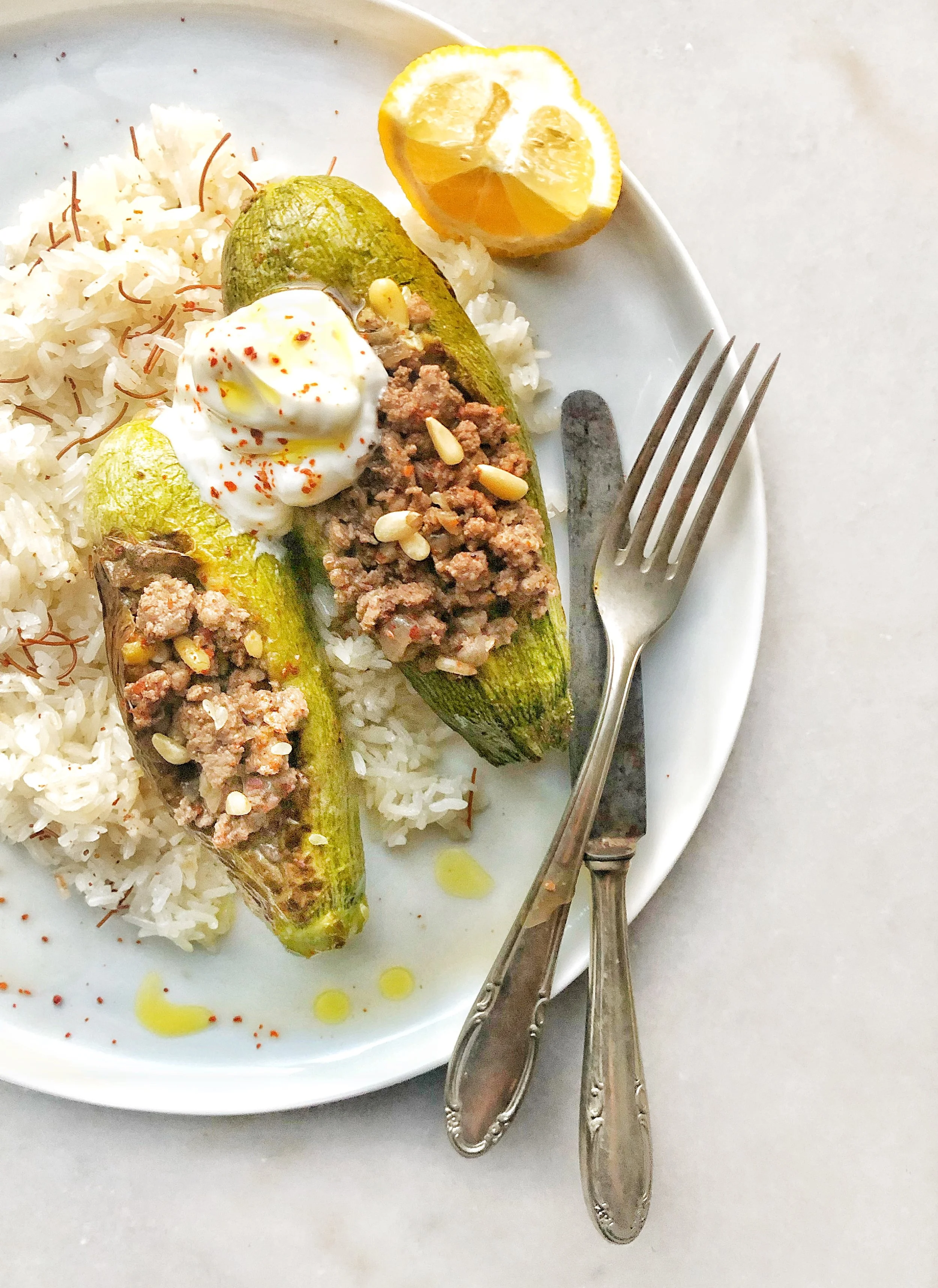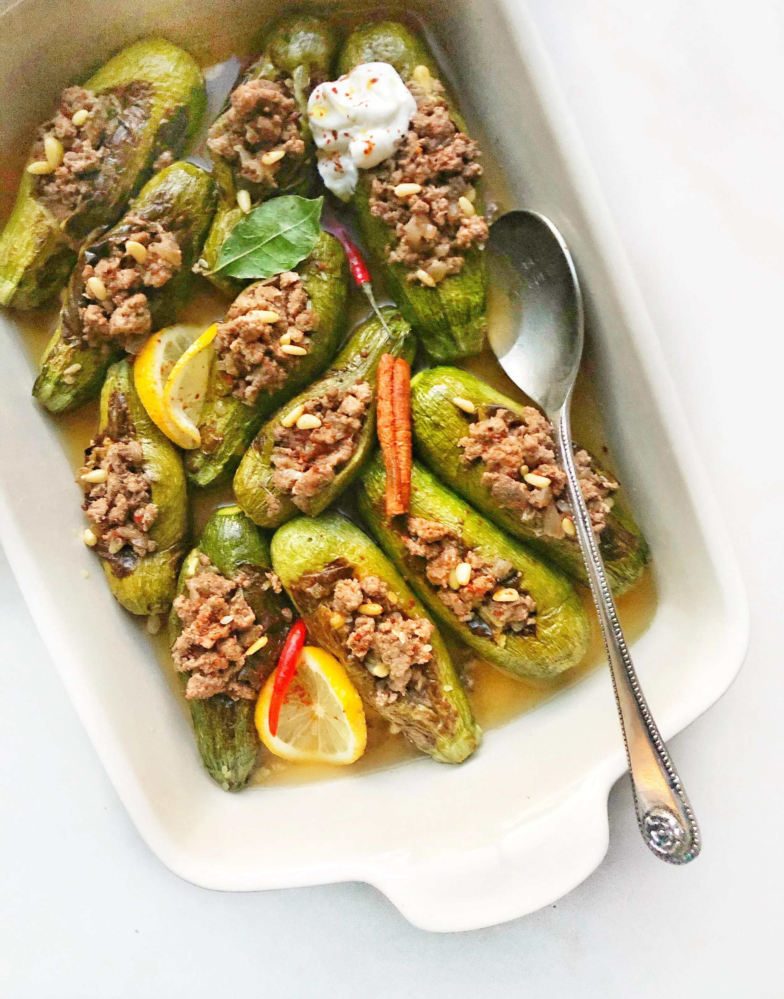 Sheikh el Mahshi. In Arabic the word shiekh could refer to many things among them is leader, chief, old, or an expert of sort. So I am guessing this recipe is called sheikh al mahshi due to the fact that the squash is stuffed with a luxurious mixture of spiced meat and pine nuts compared to the traditional filling of rice and meat. I also think it tastes so delicious crowning itself as the chief of all stuffed vegetables.