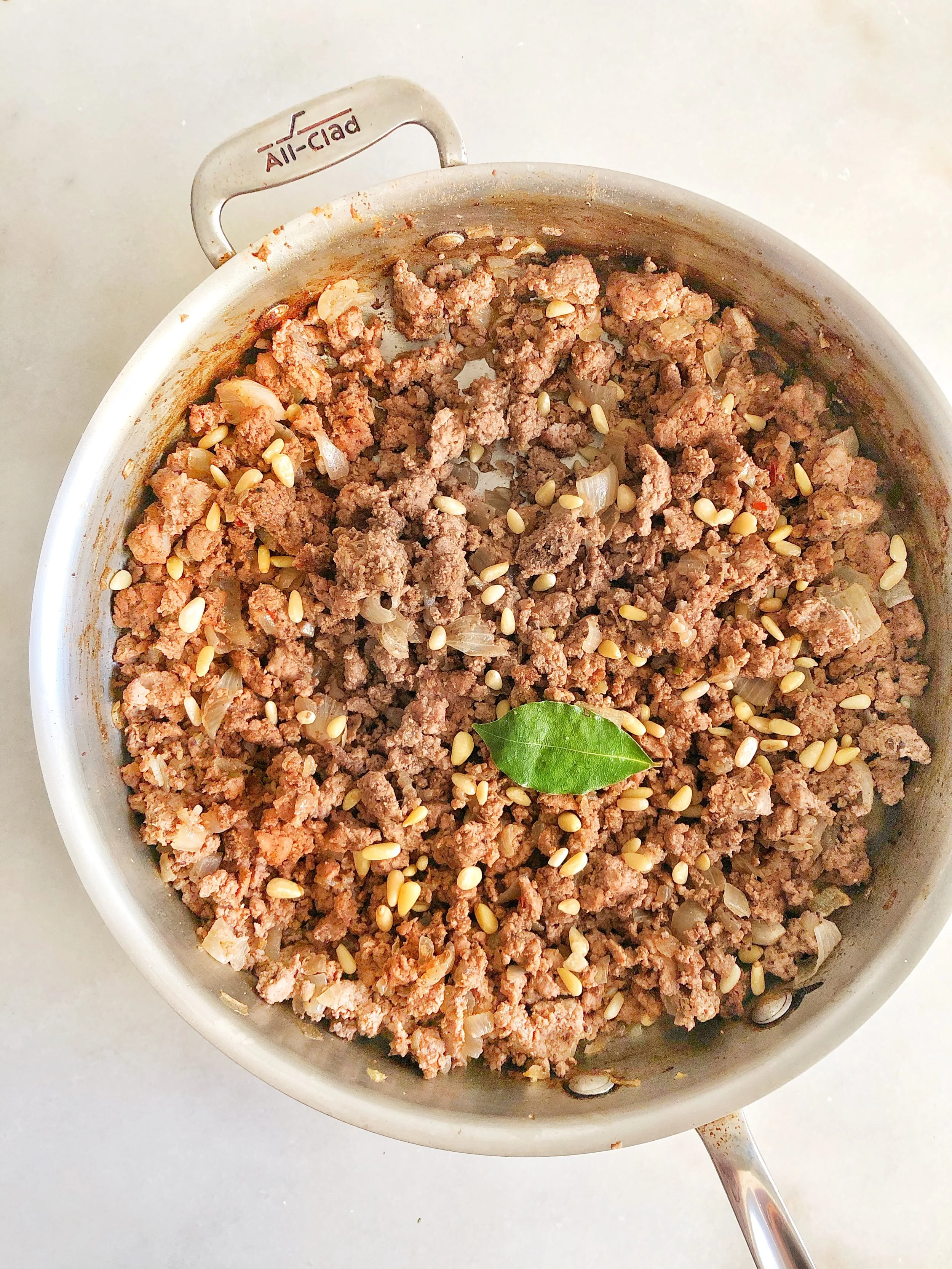 In the meantime let’s make the stuffing: sauté the onions in 2 tbls of olive oil until translucent 5-8 minutes.Add the minced meat and break it apart with the back of your wooden spoon. Add the spices and cook until the meat is cooked through and no longer pink. Add the pine nuts and toss to combine