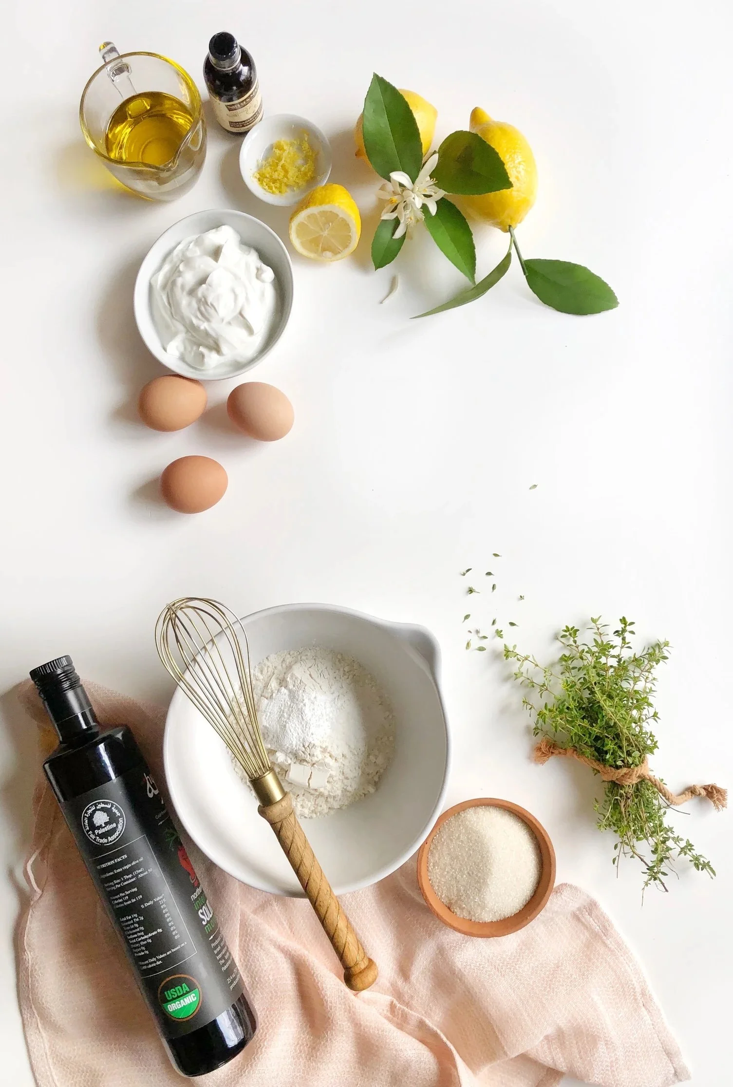 This lemon and olive oil cake is tribute to winters in Palestine, and to me longing for the home where I grew up. Bright and refreshing lemons often come from Jaffa or Jericho, and fruity olive oil comes from the hills of Palestine. Creamy yogurt and earthy mountain thyme are then mixed together to make this delicious and moist loaf.