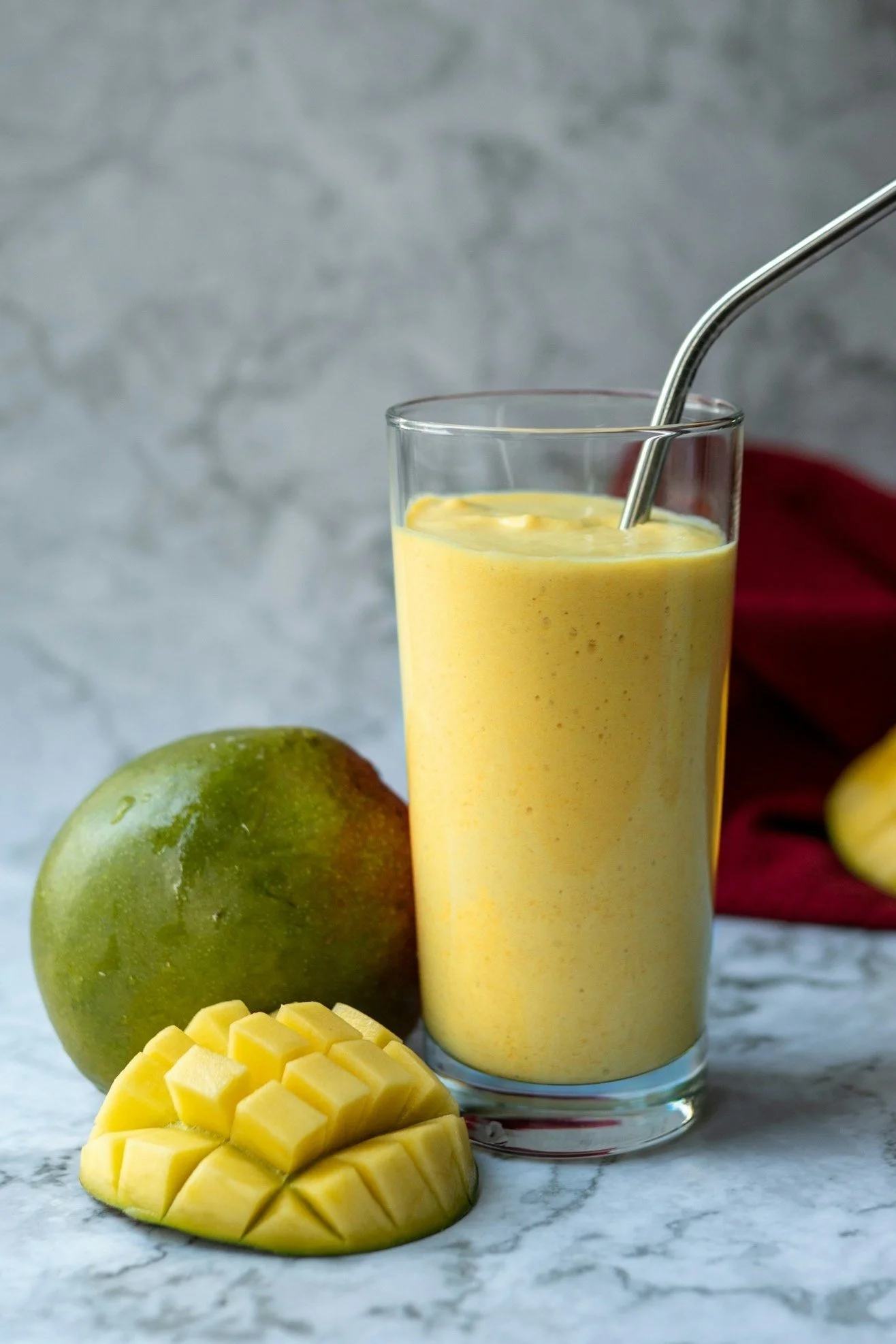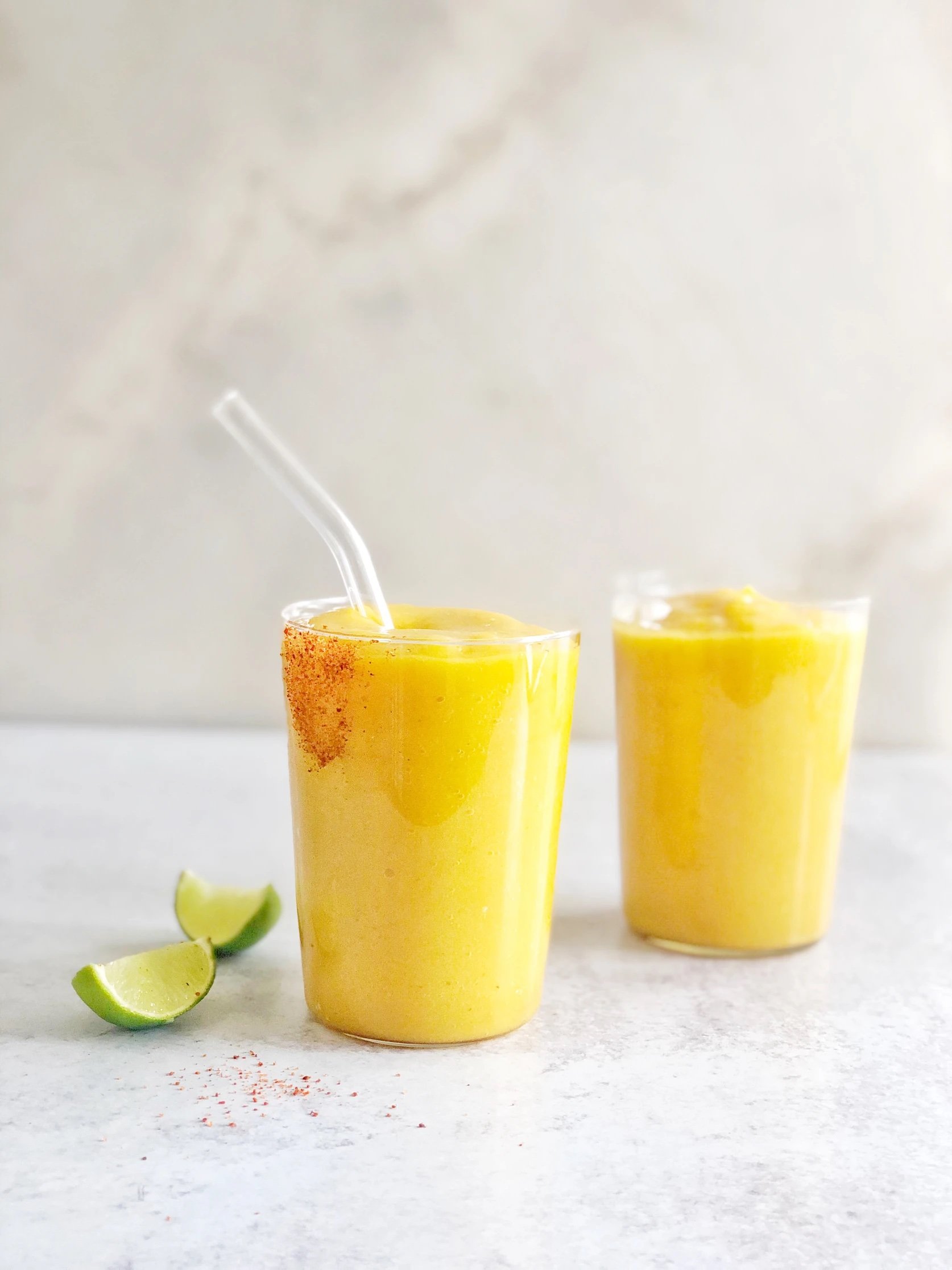 3 cups frozen or fresh mangos. If you are using fresh mangos then add ice, zest, and juice of one or two limes. Adjust to your taste