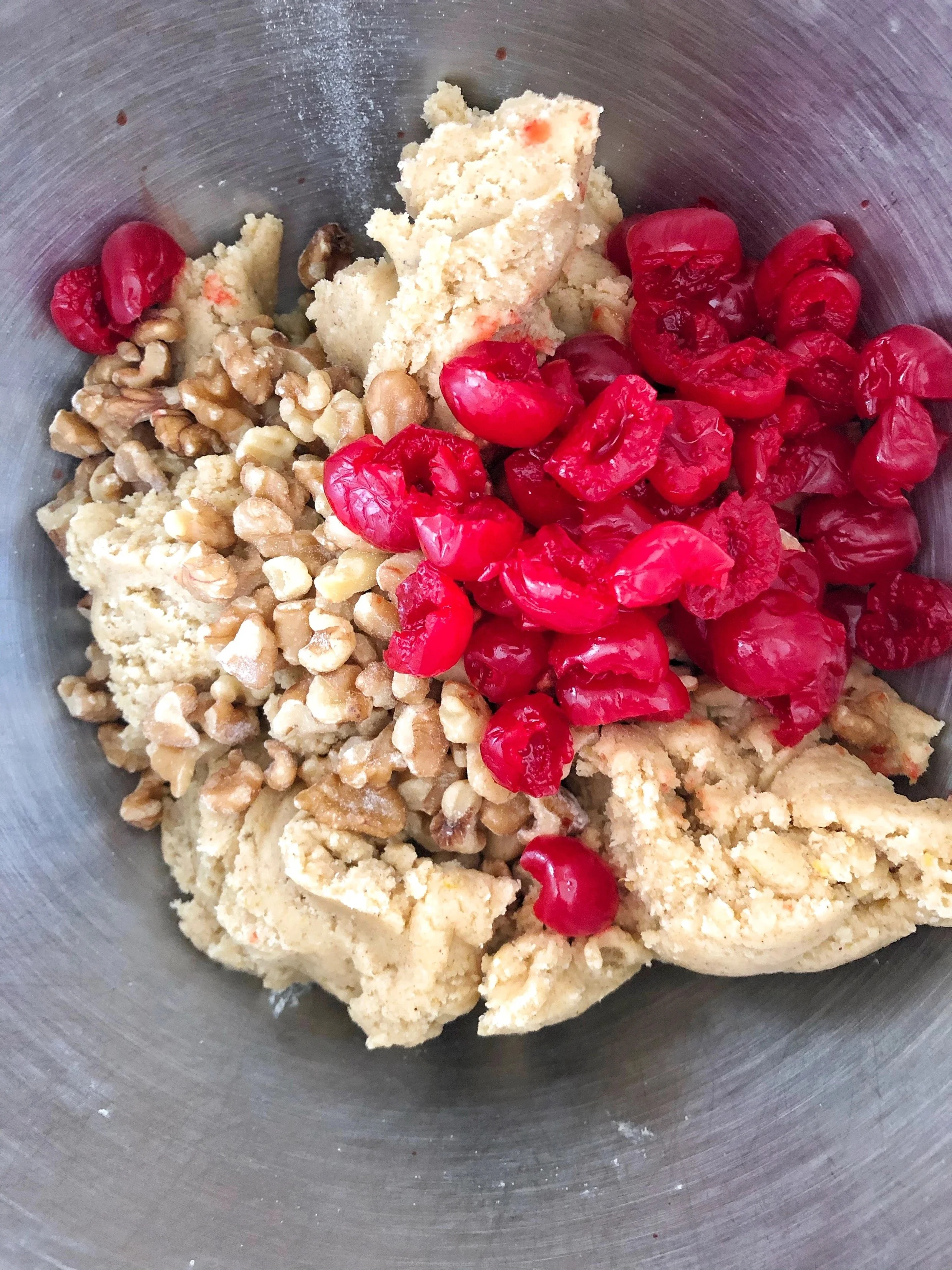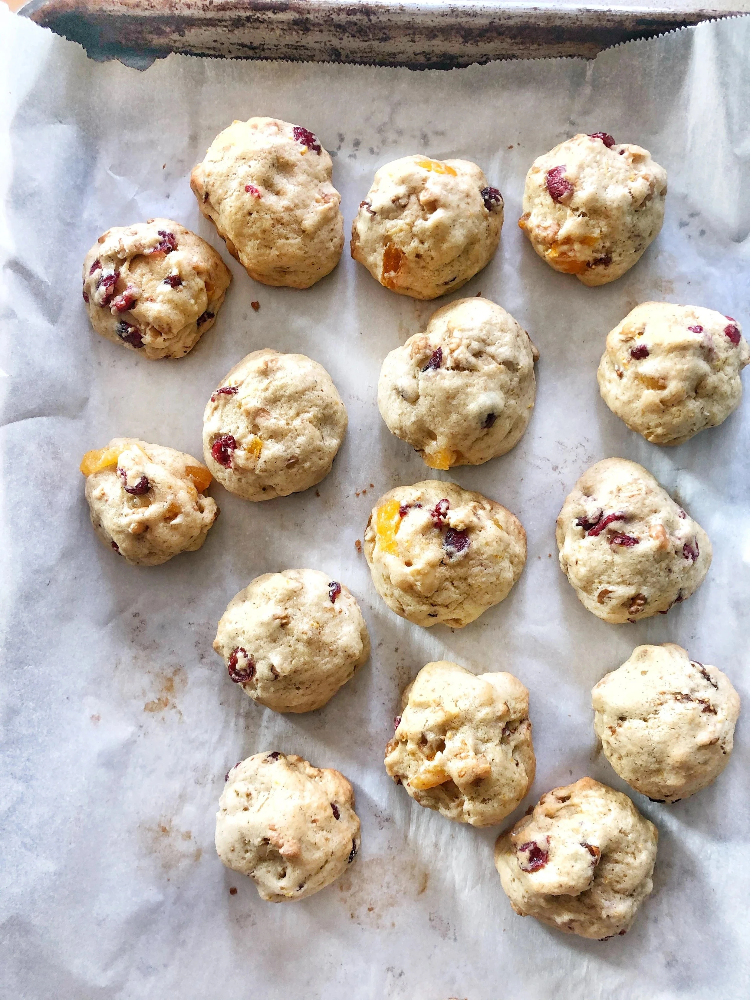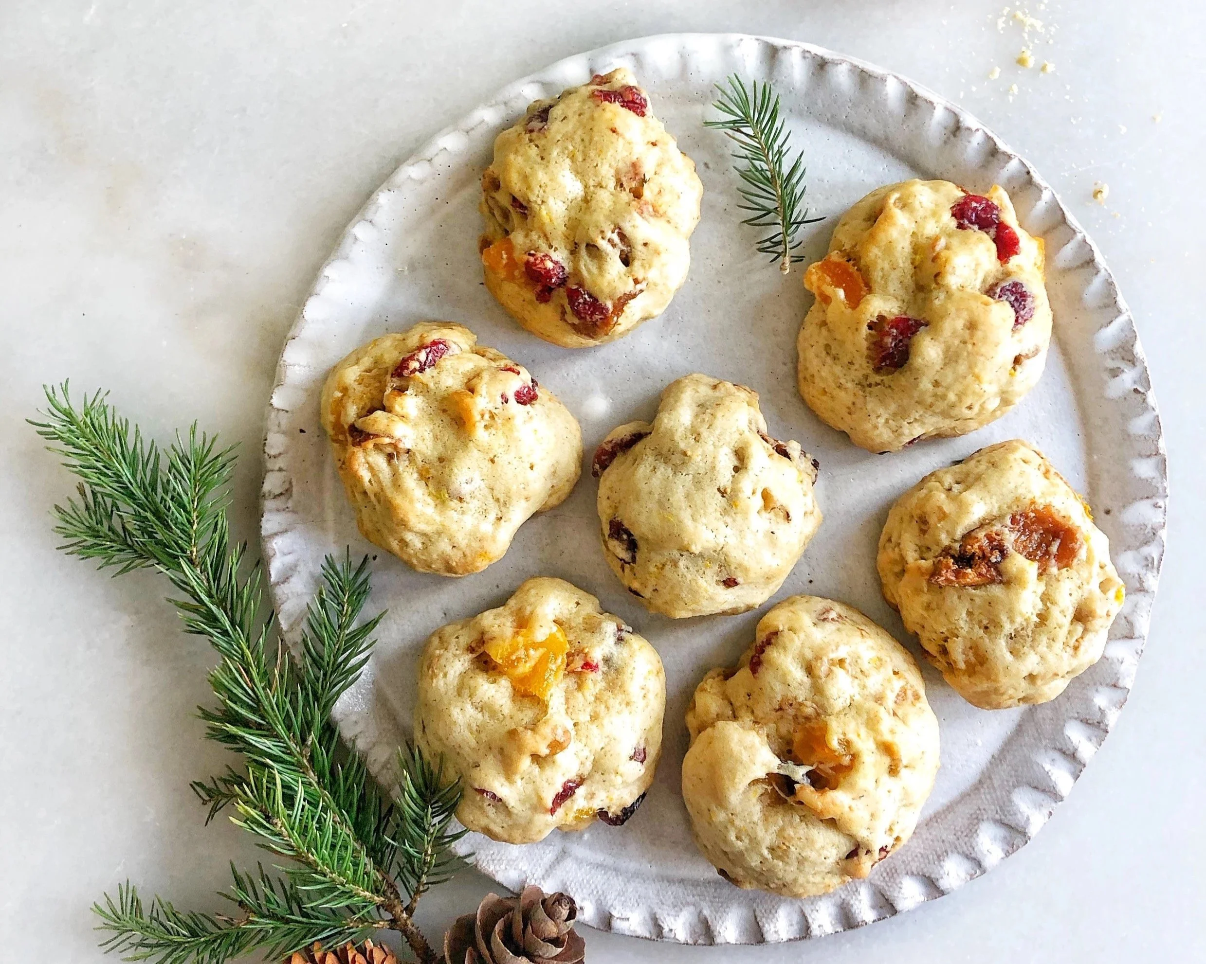 My mom learned these cookies from my aunt Aida. You see my aunt Aida taught at the Lutheran school where both my mom then later I and my siblings went in the old city of Jerusalem. So we believe that's how this cookie came about. The German influence came from the German language teachers that taught at our school at the time. I just changed the dried fruit of the typical bright green and red candied cherries that my mom used, to dried cherries, apricots, and figs. The cookie is often flavored with rum, warm spices like all spice, cinnamon, ginger & nutmeg. Everyone has a specific taste of the holidays. Mine is this spice soft and cakey cookie that filled our home growing up with warm aromas and now it fells my heart and connects me with home.