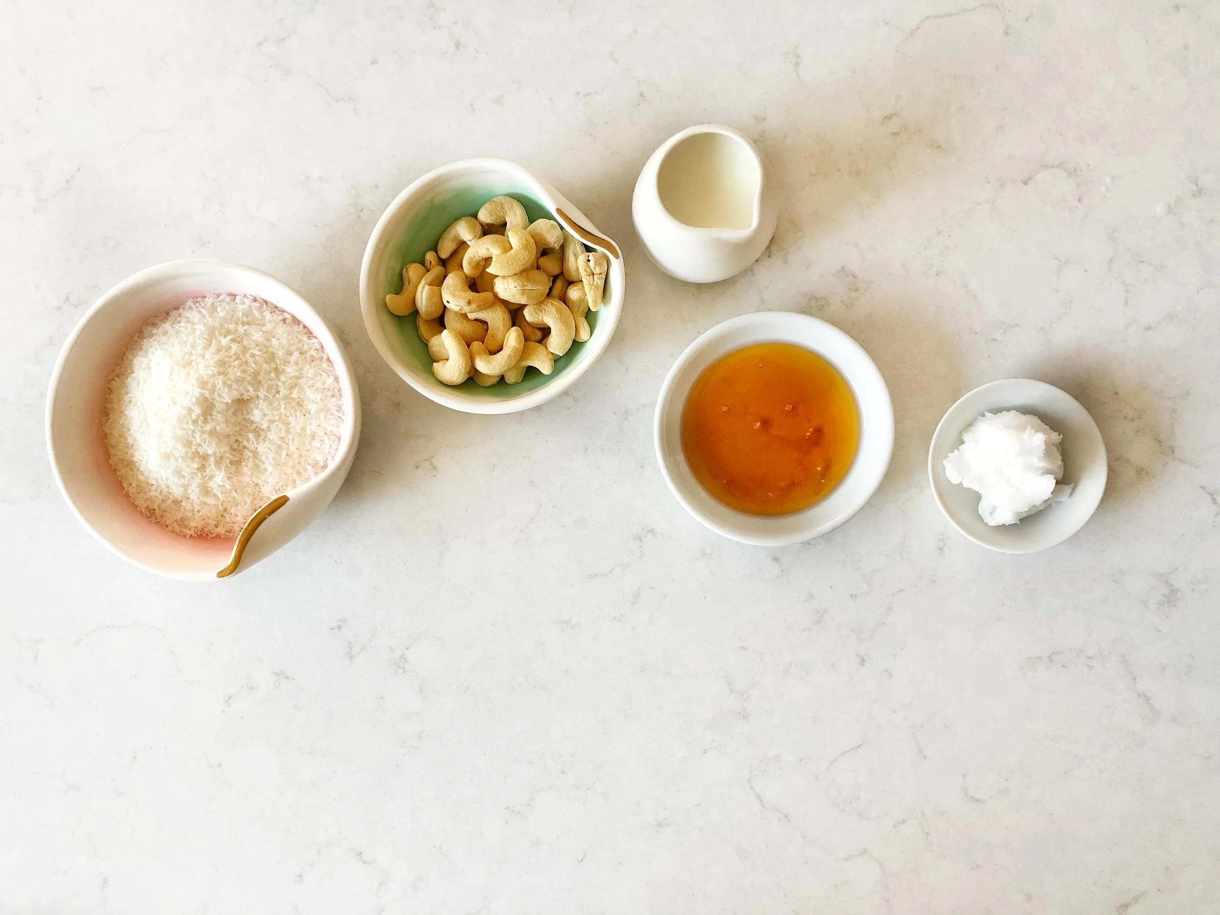 In a food processor, pulse cashews until you get a coarse crumble. Add coconut, and coconut oil in a food processor and pulse until very fine