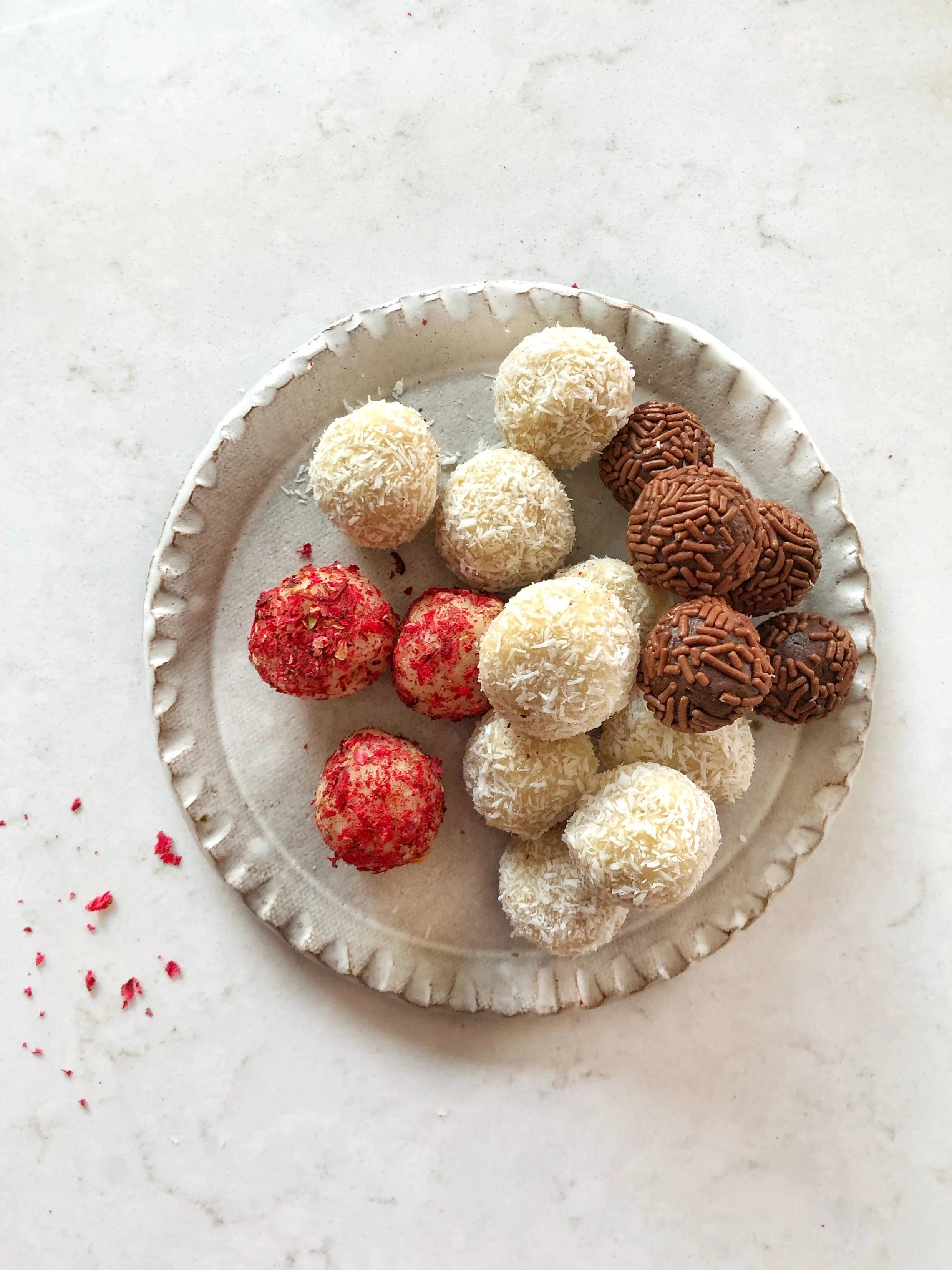 Roll the balls in sprinkles, nuts or coco powder to finish