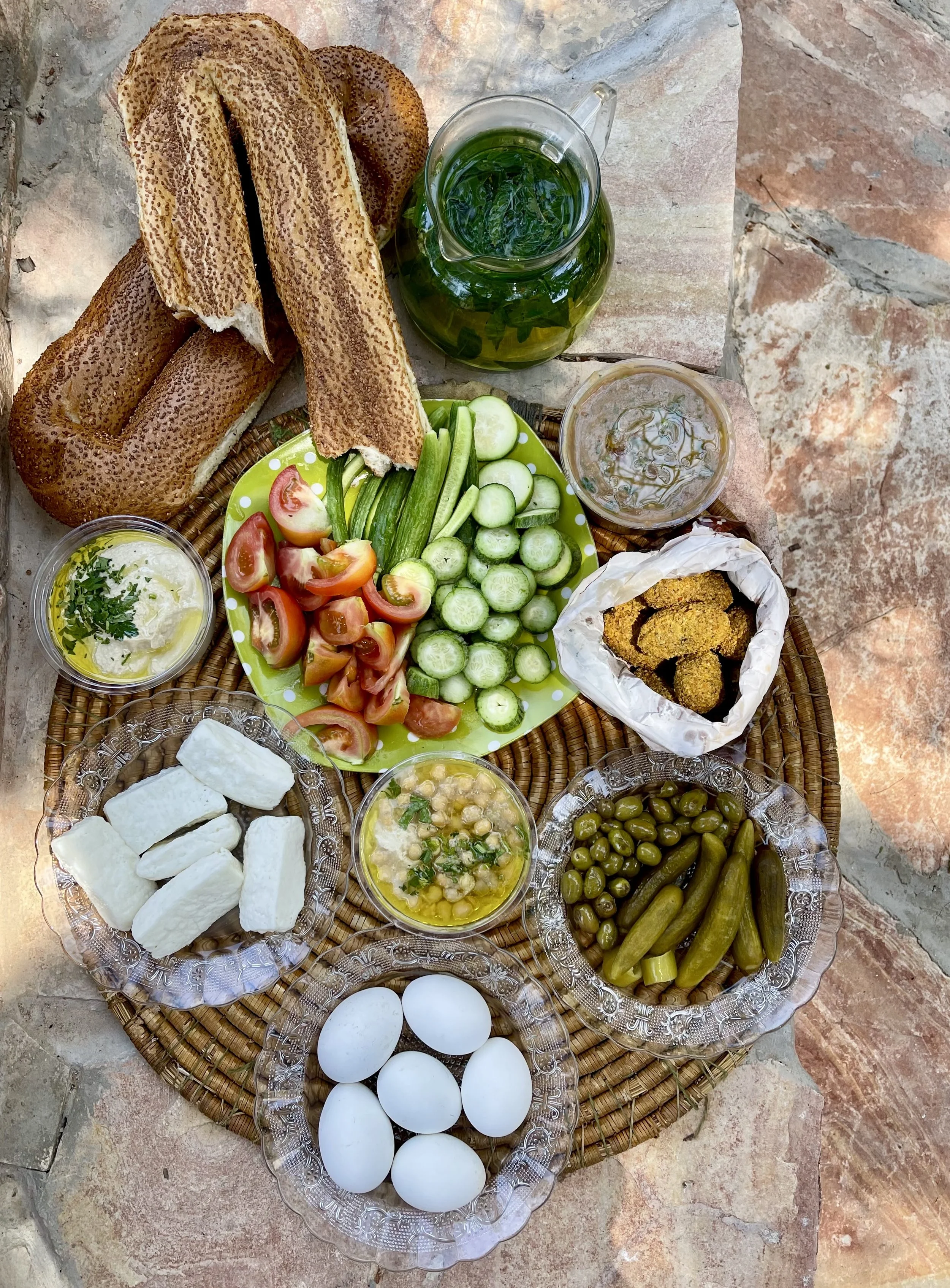 The Palestinian brunch table is meant to be savored and enjoyed slowly, very much like a mezze spread. The family gathers around a long table filled with small plates of deliciousness. Coffee is never part of the picture. Mint tea is served in the summer, and sage tea is served in the winter.