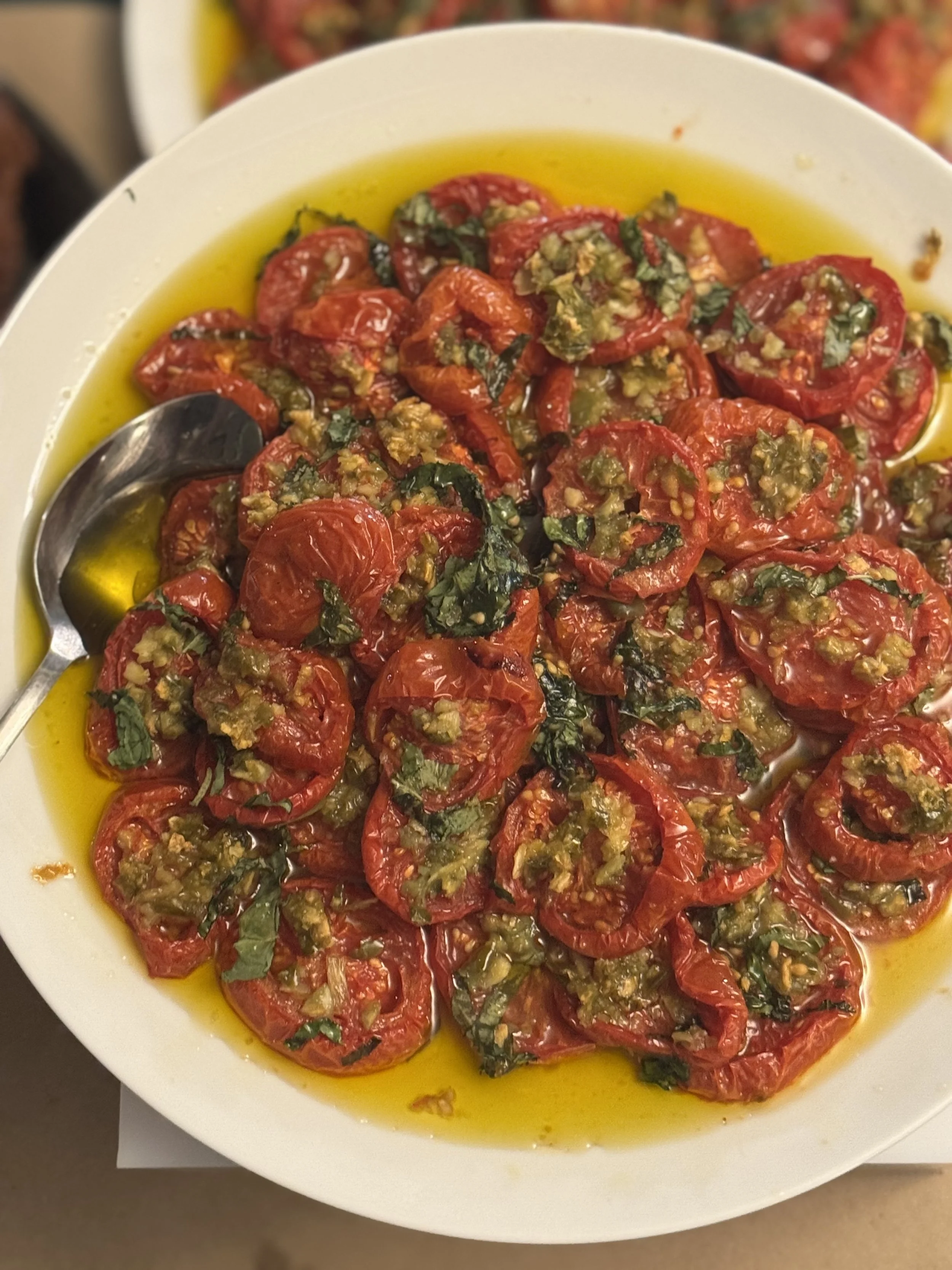 Breakfast is always accompanied by freshness—often with a side of thinly sliced tomatoes and fresh mint. A plate of vegetables like cucumbers, tomatoes, peppers, and herbs is always served. An egg dish is present at the breakfast table in many forms: herb ijeh (a Palestinian frittata), hard-boiled eggs drizzled with olive oil, or my dad’s favorite—fried eggs with sujuk (local Armenian sausage), crisped in golden olive oil and sprinkled with sumac.