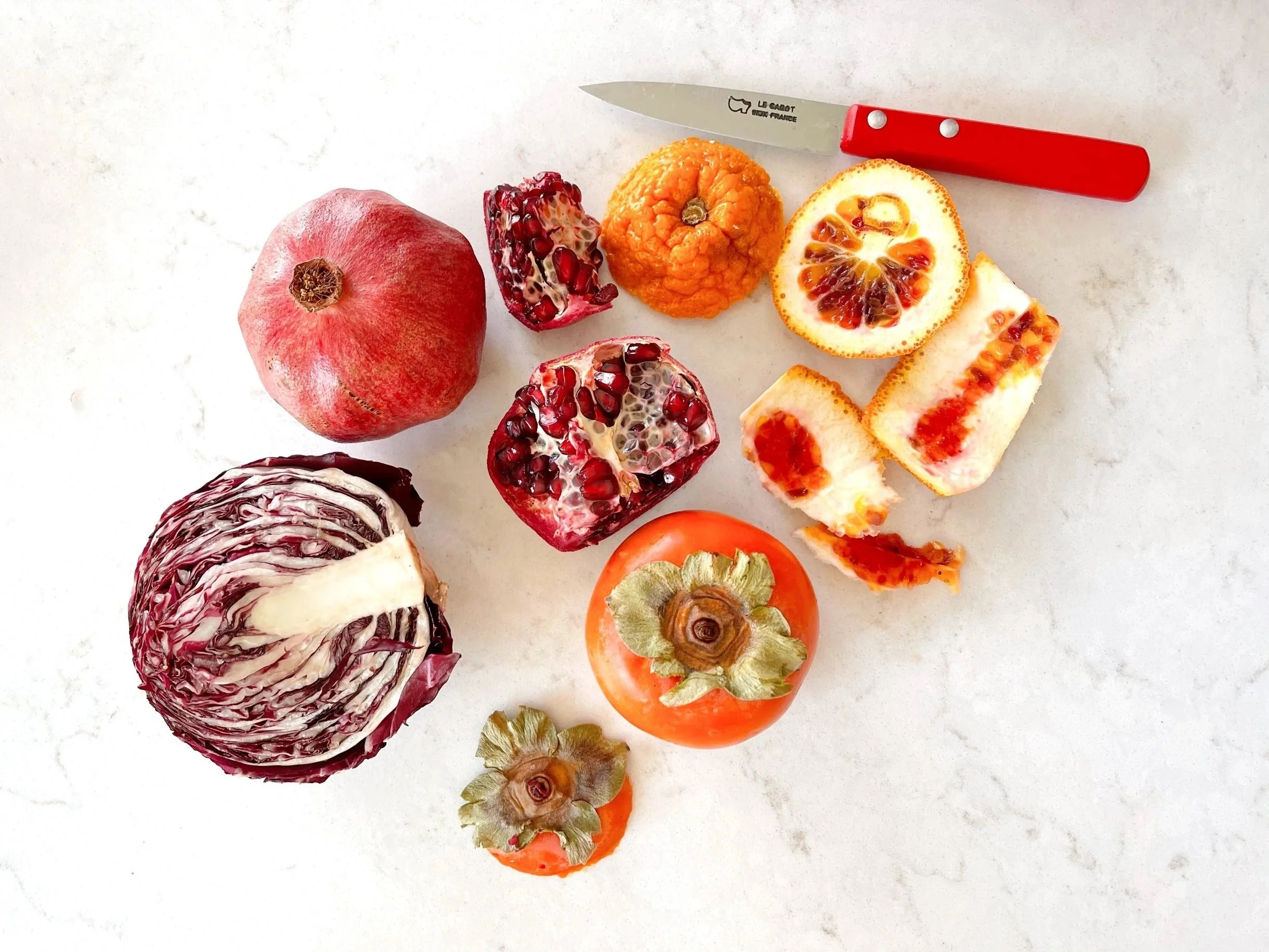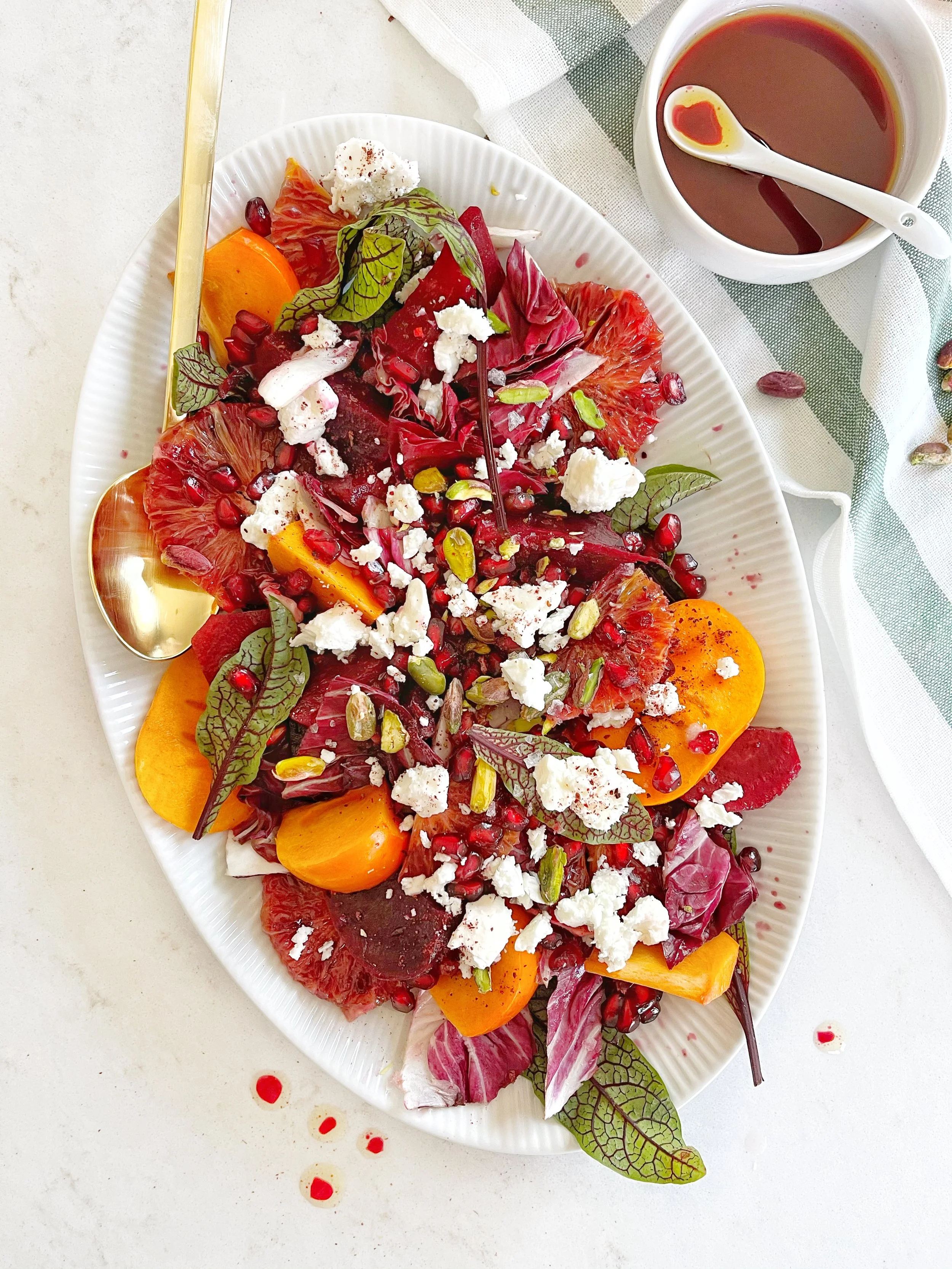 Fresh firm fuyu persimmons , fresh citrus, crispy and slightly bitter radicchio that’s complemented by the earthy beets and fruits, crunchy toasted pistachios, and salty feta cheese. Running out of adjectives here lol. but the dressing is prob my fav part. I make a jar full and leave it in the fridge. Its a tangy-sweet fresh pomegranate and sumac vinaigrette. That compliments all the sweets and slightly bitter flavors that are going on in the Holiday salad.