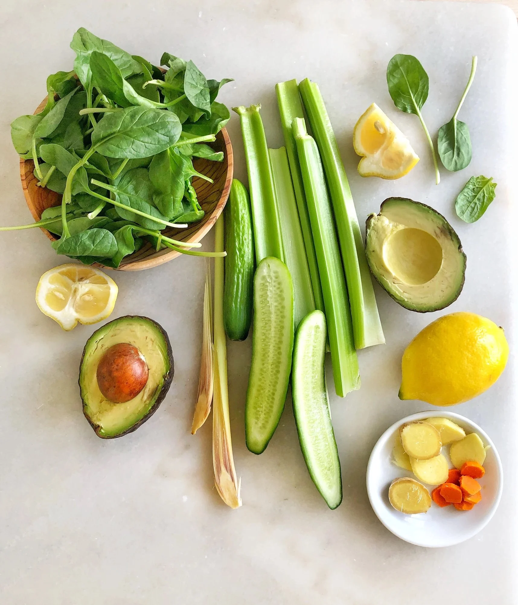 In a high speed blender combine: first cucumber, celery, fruits, ginger, lemon grass, turmeric, add water.