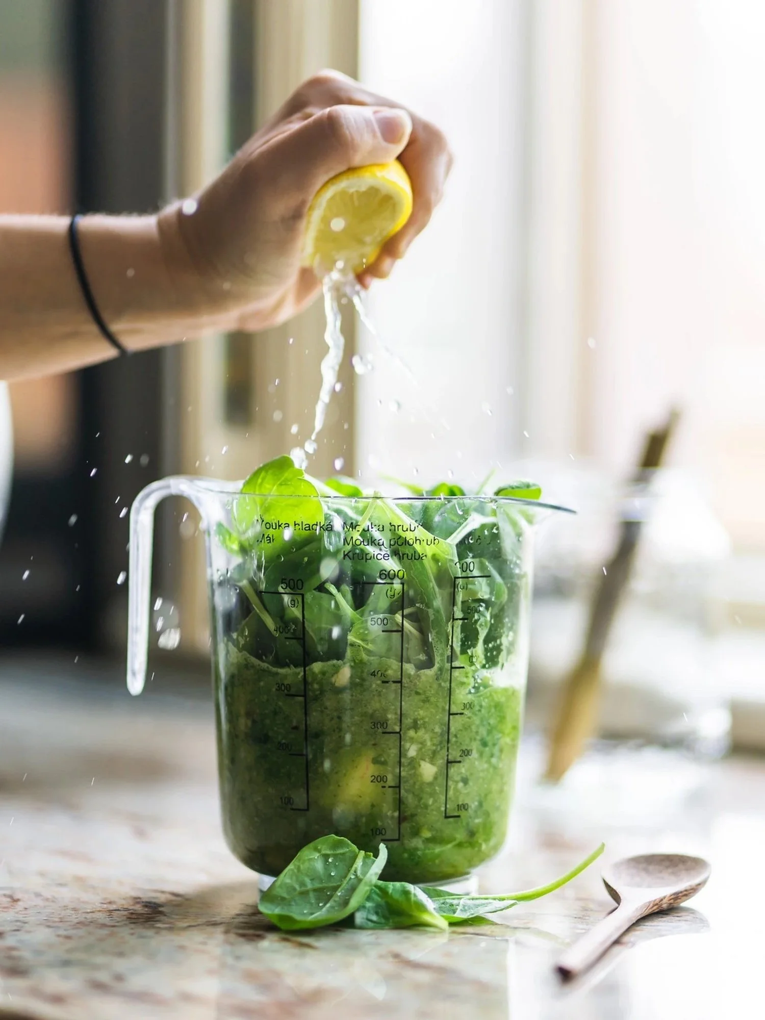 2 handfuls of fresh spinach (any green leaf will do). You can try to mix kale and romaine, arugula... etc