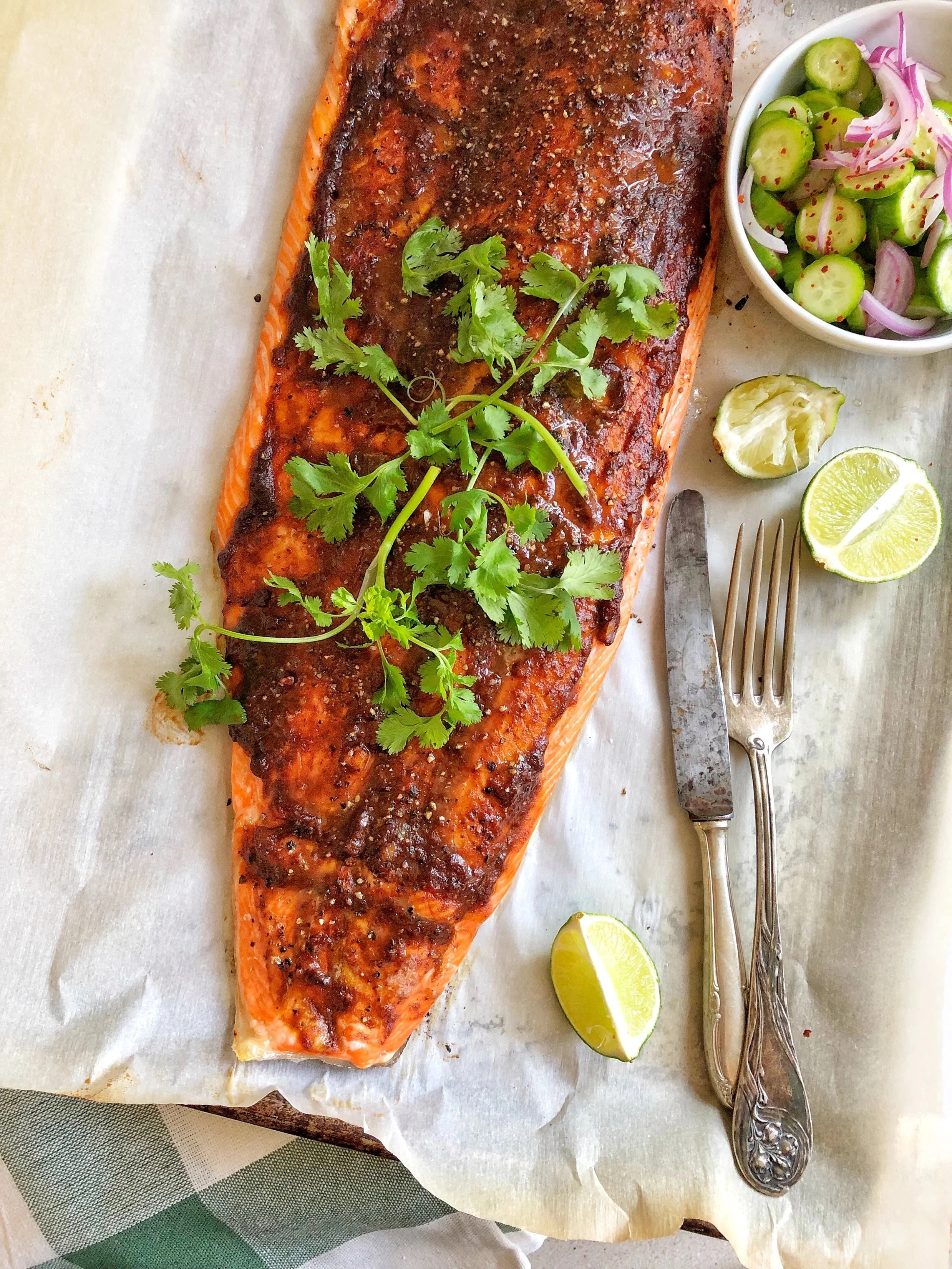 Tamarind, and ginger BBQ sauce. I dream and reimagine flavors where East meets West. This BBQ sauce is so so good and has bold flavors perfect for your summer grilling. The sauce is thick and syrupy, a bit sweet, tangy, a bit spicy and just finger lickin’ good .. I tested this BBQ sauce on so many things and oh it’s so good even on fruits. Try my oven roasted salmon its so perfect for a weeknight meal and beautiful enough for company.