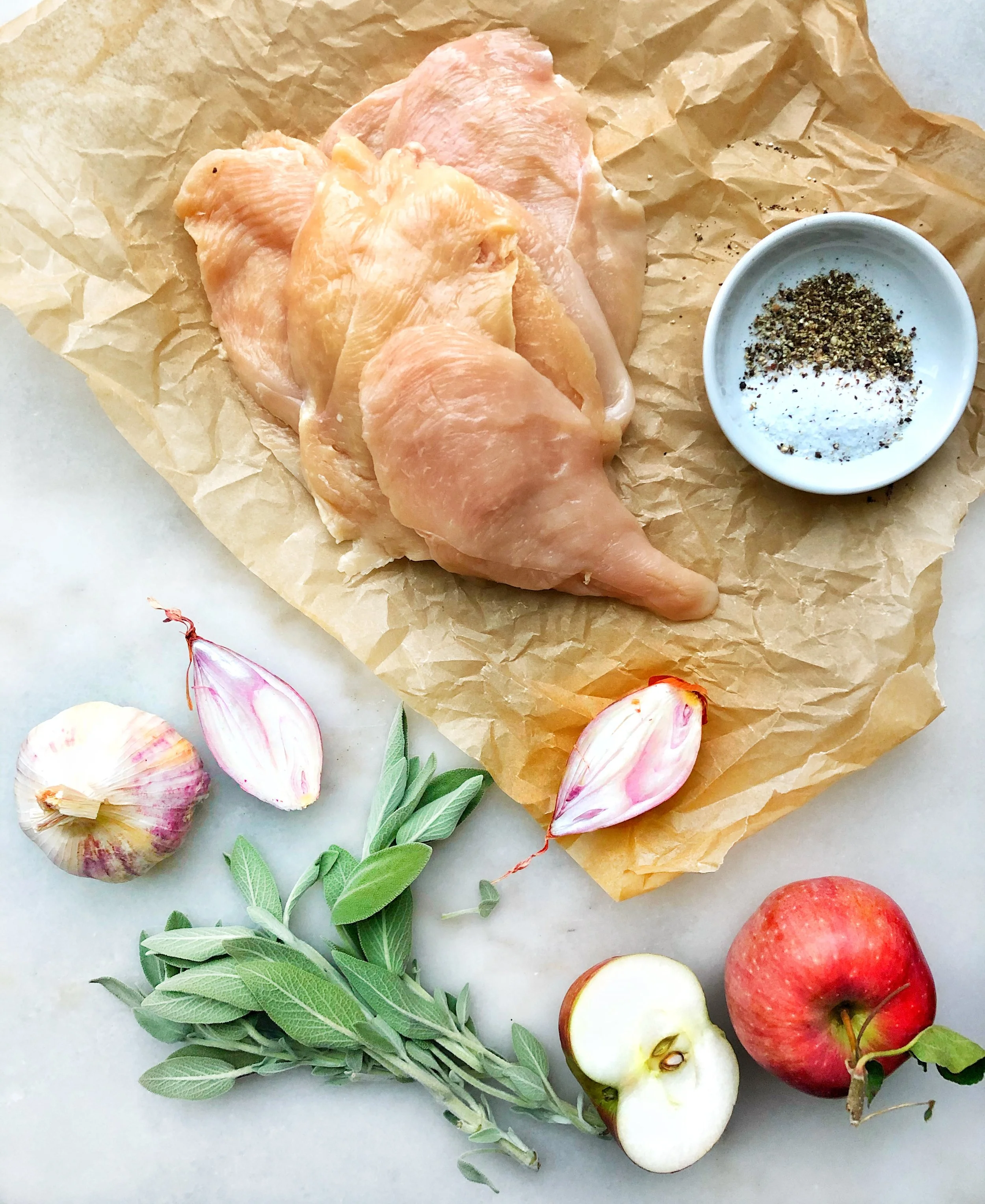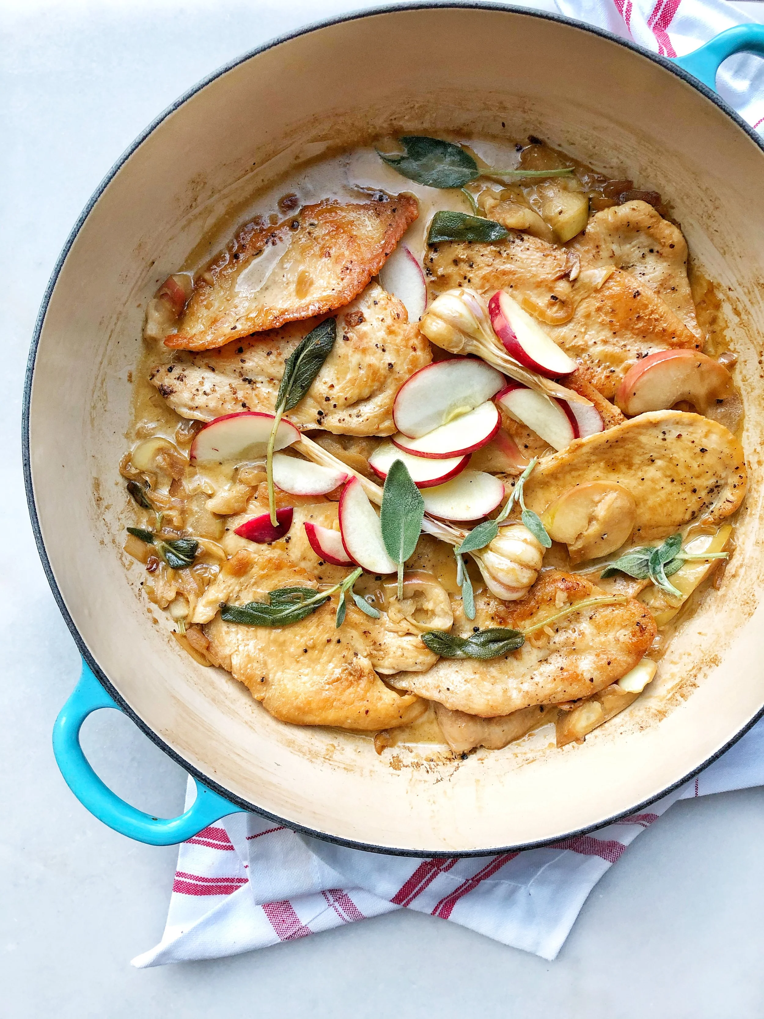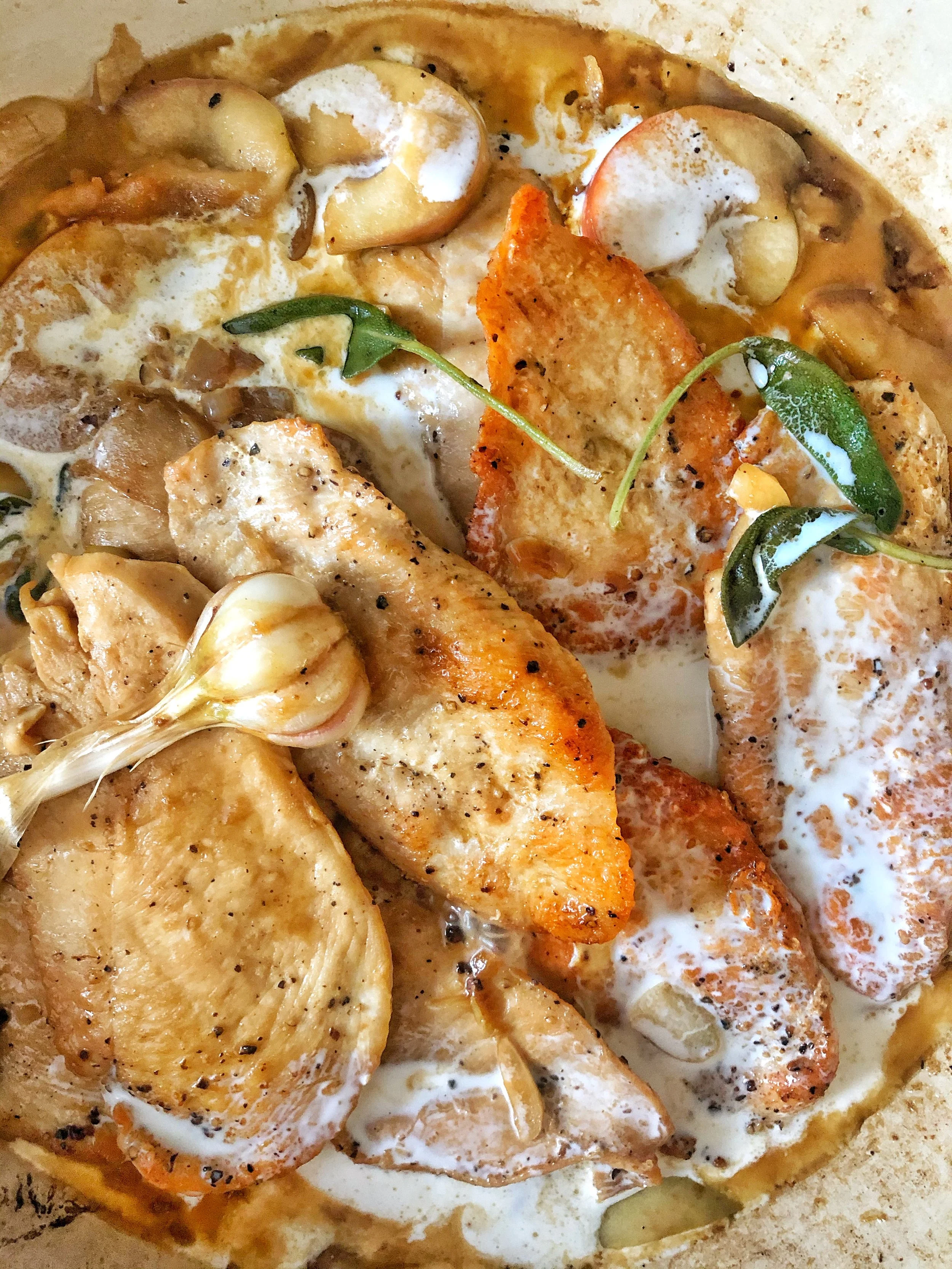Serve the chicken topped with the sauce and Fresh sage and the diced pickled apples to brighten the flavors and cut through the richness of the cream.