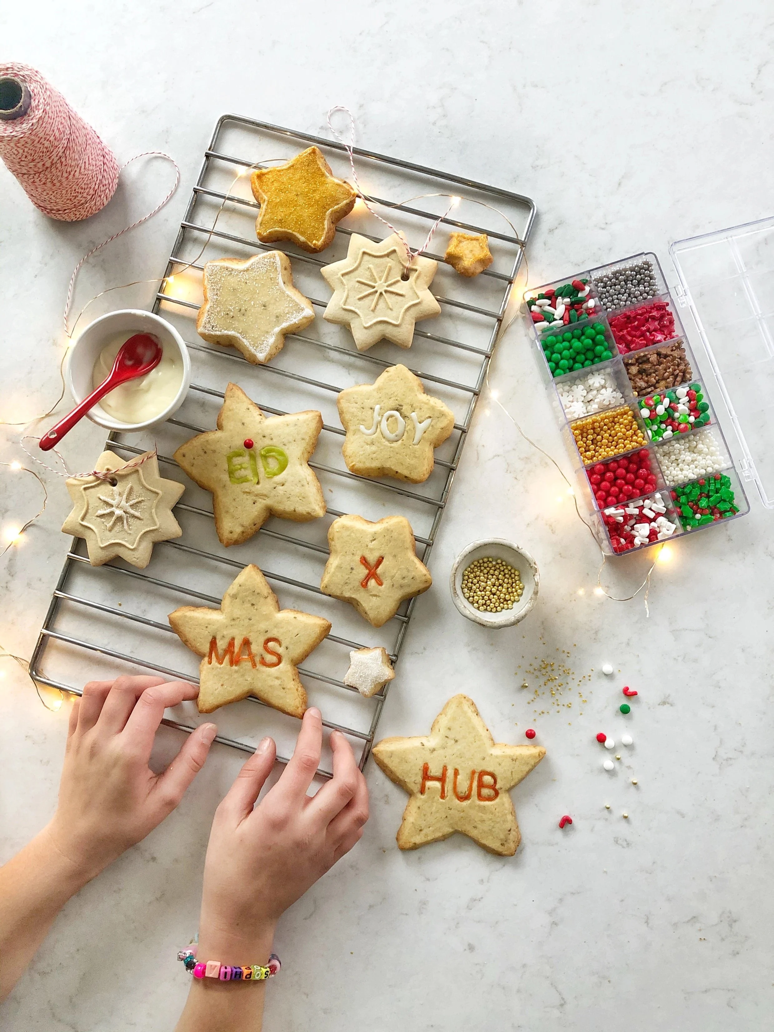 This tradition all started when a friend shared with me what she claimed to be the perfect cut out cookie recipe. I was an intimidated baker 15 years ago so i wanted to believe her. she sent me a clipped page out of i think a Parents magazine . And i never looked back again at any sugar cookie recipe. because when you find a recipe for a good one, you hold on tight. Although its a family joke that i add anise seeds to the cookies but we all love it so much and its the cookie Santa is been requesting for years. It even became the cookie of choice for my friend tammy. Tammy and I bake together for the holidays every year and this is the recipe she always requests. I know how to make these cookies with my eyes closed but please don't ask me about any frosting tips, you can see for yourself in the photo above, the lines are barely straight. Wishing you Hub (love), Farah (joy) and Salam (peace) this holiday season and always.